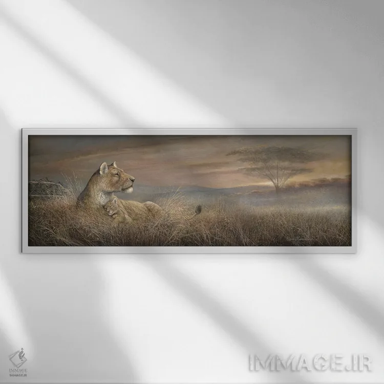 براساس پالت گرم اثر، قاب بلوط روشن (چوبی) پیشنهاد اول است و استخوانی ملایم مکمل. برای سفارشهای پروژهای با ابعاد و قابهای اختصاصی با ایماژ در تماس باشید.