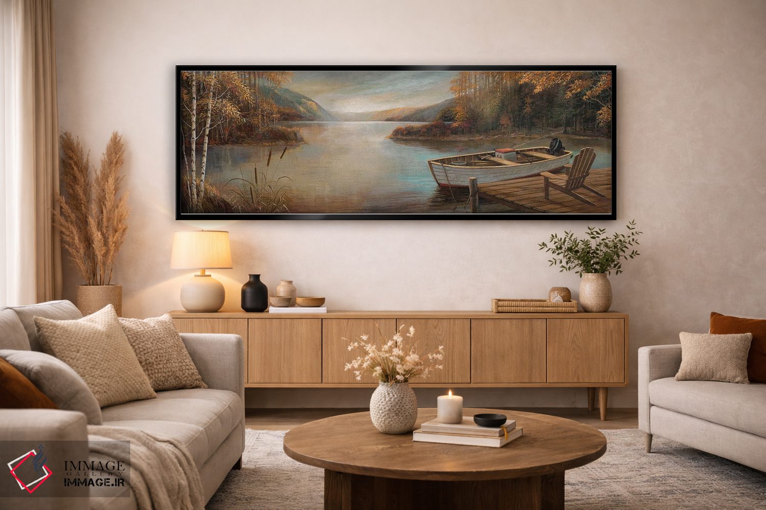 براساس پالت گرم اثر، قاب بلوط روشن (چوبی) پیشنهاد اول است و استخوانی ملایم مکمل. برای سفارشهای پروژهای با ابعاد و قابهای اختصاصی با ایماژ در تماس باشید.