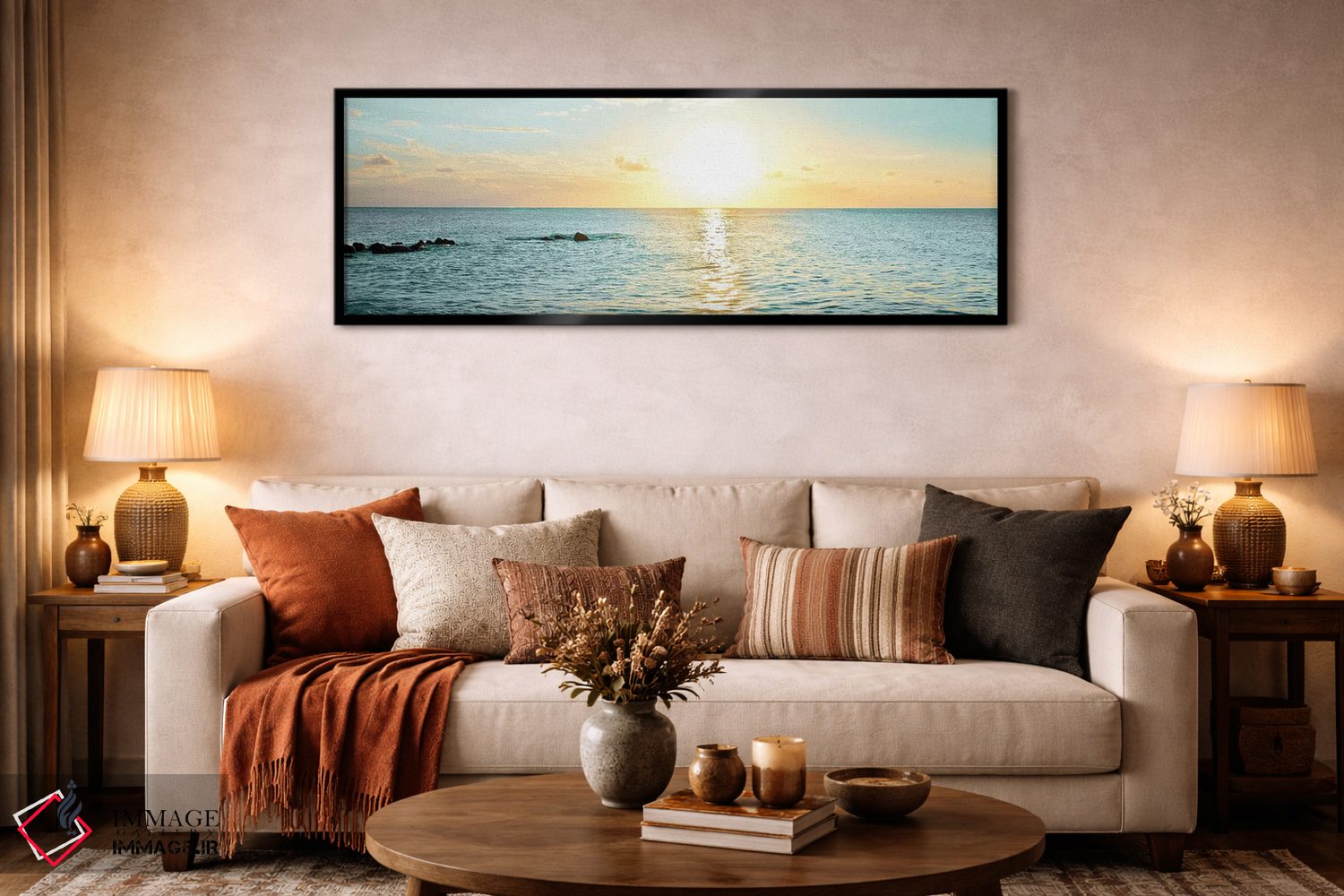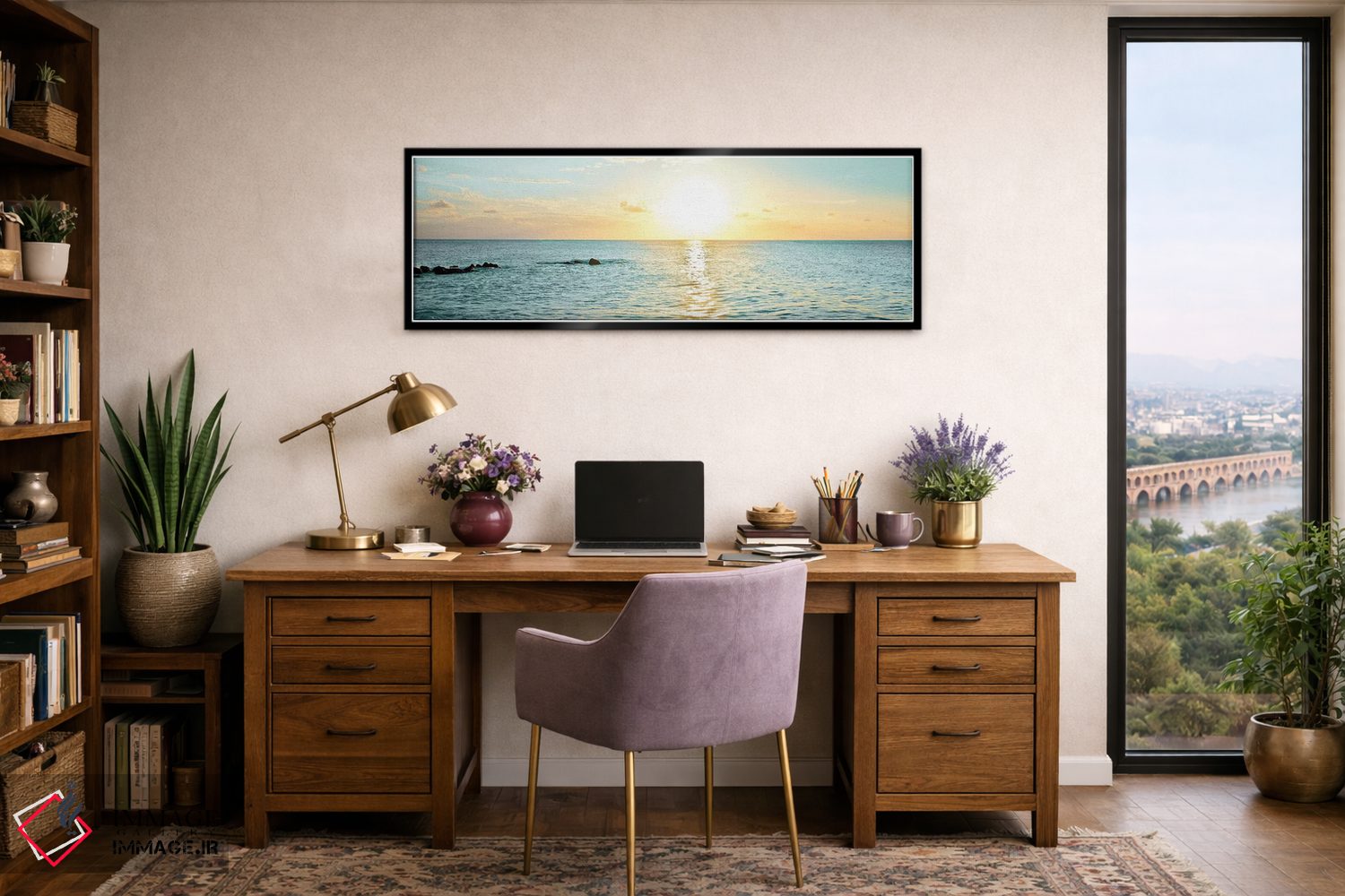 براساس پالت گرم اثر، قاب بلوط روشن (چوبی) پیشنهاد اول است و استخوانی ملایم مکمل. برای سفارشهای پروژهای با ابعاد و قابهای اختصاصی با ایماژ در تماس باشید.