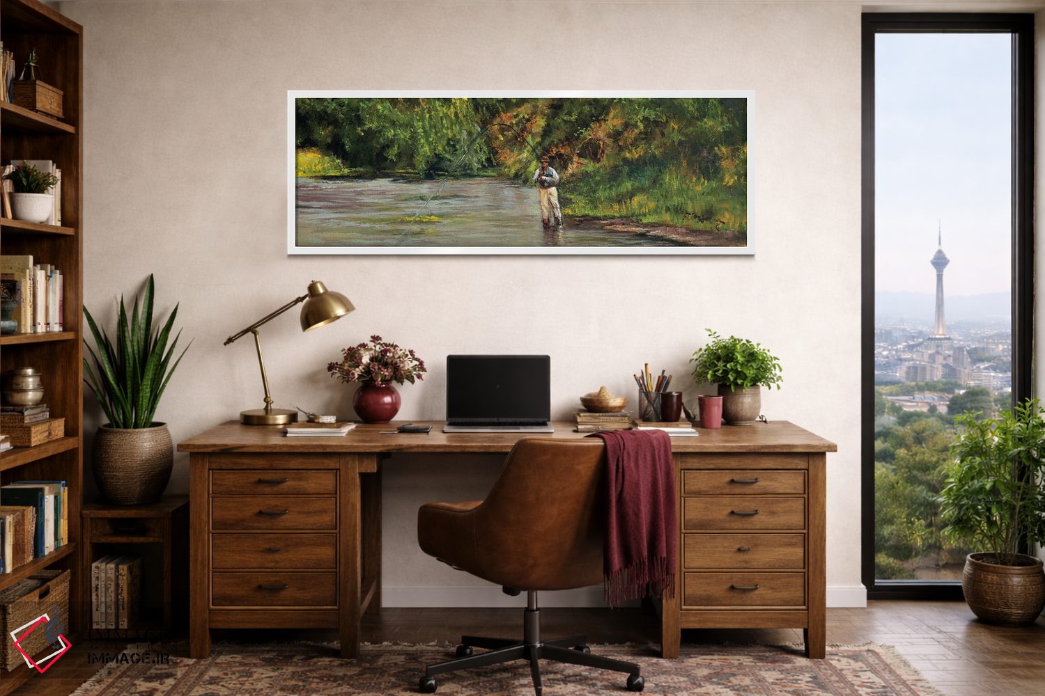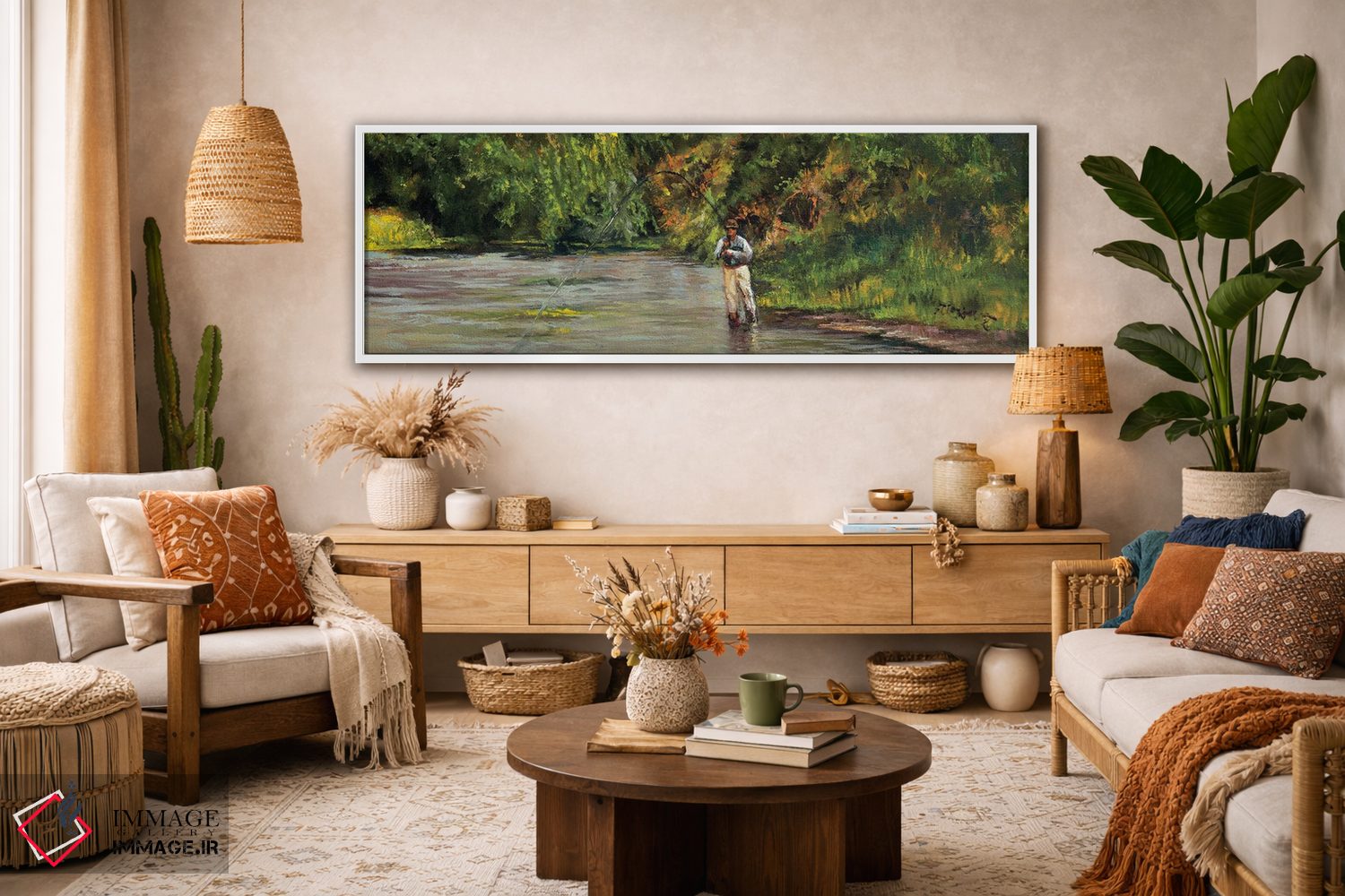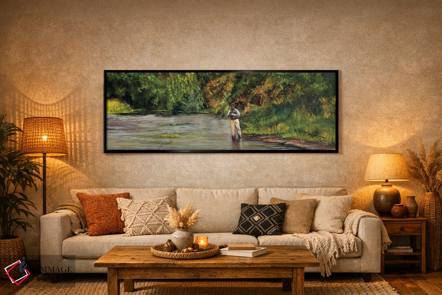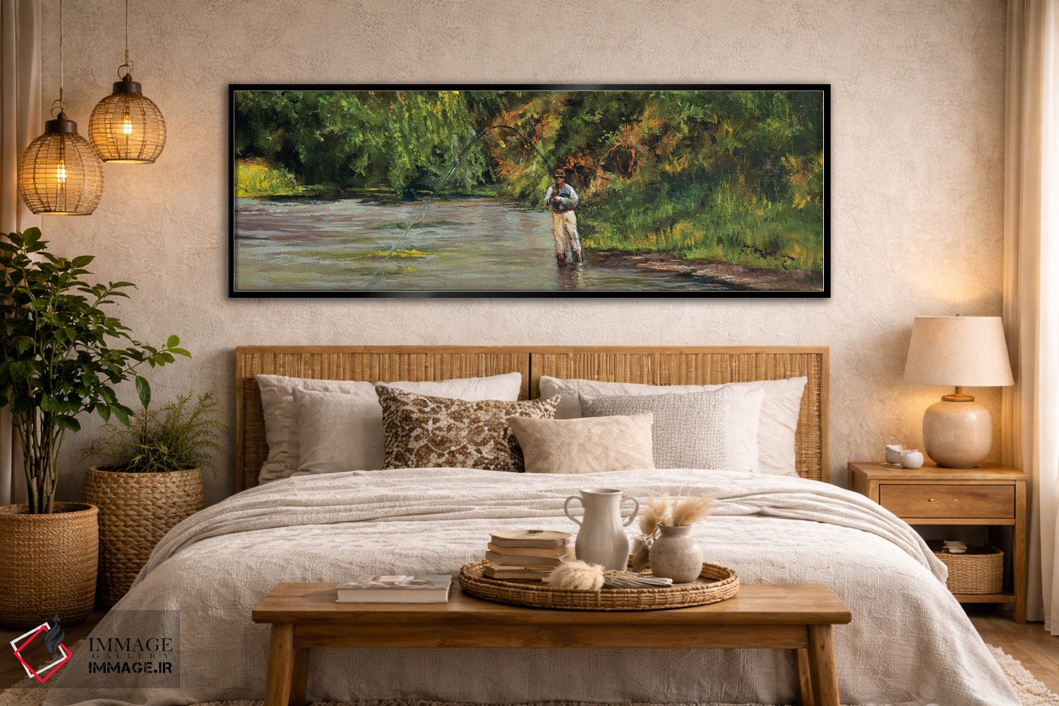 «صید ماهی در جویبار کوچک» اثرِ «شرلی کلیری» با حالوهوای دکور کلبه و لژ و موضوعِ این اثر، برای کنار چوب تیره و نور گرم انتخابی گرم و صمیمی است.