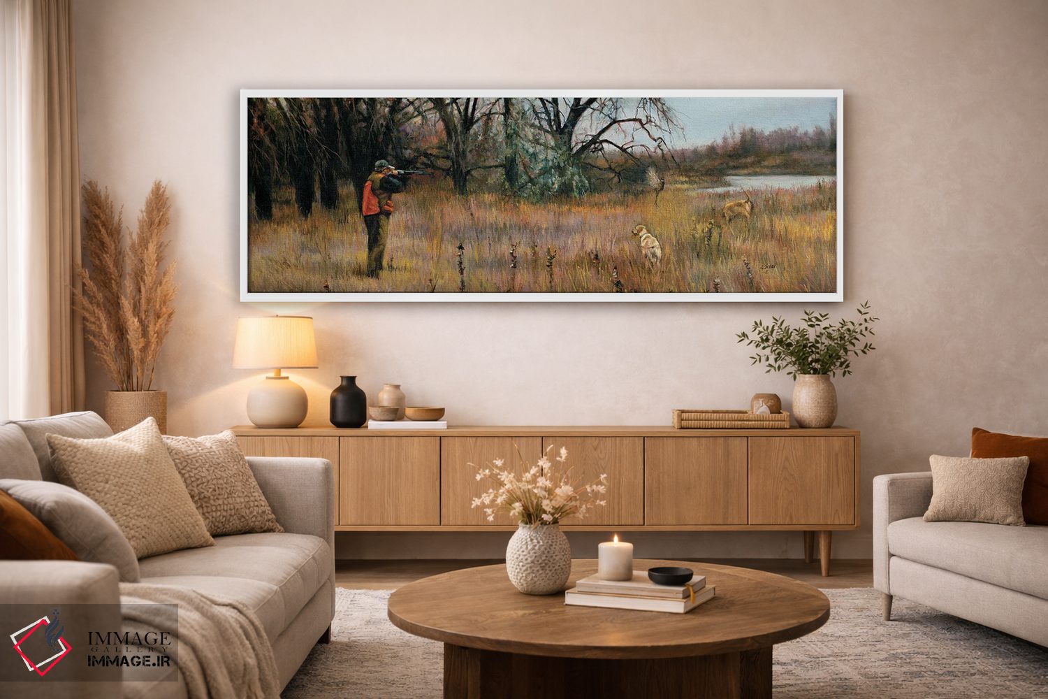 براساس پالت گرم اثر، قاب بلوط روشن (چوبی) پیشنهاد اول است و استخوانی ملایم مکمل. برای سفارشهای پروژهای با ابعاد و قابهای اختصاصی با ایماژ در تماس باشید.