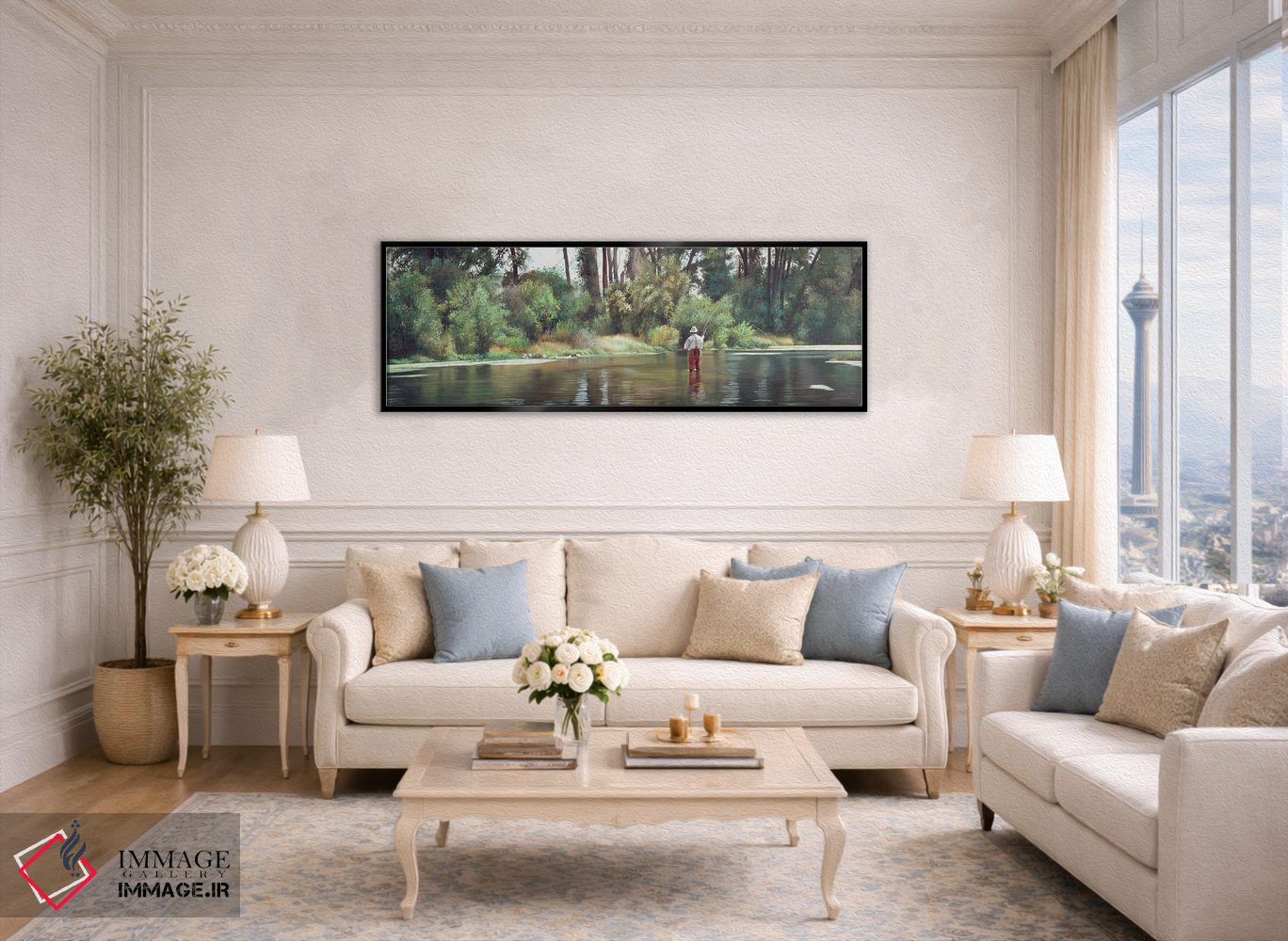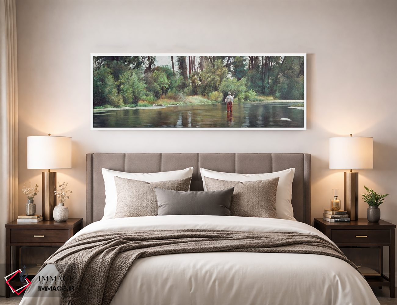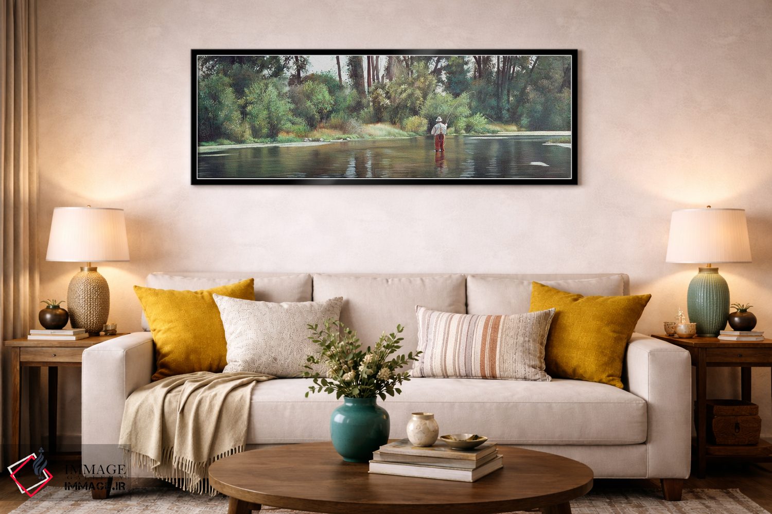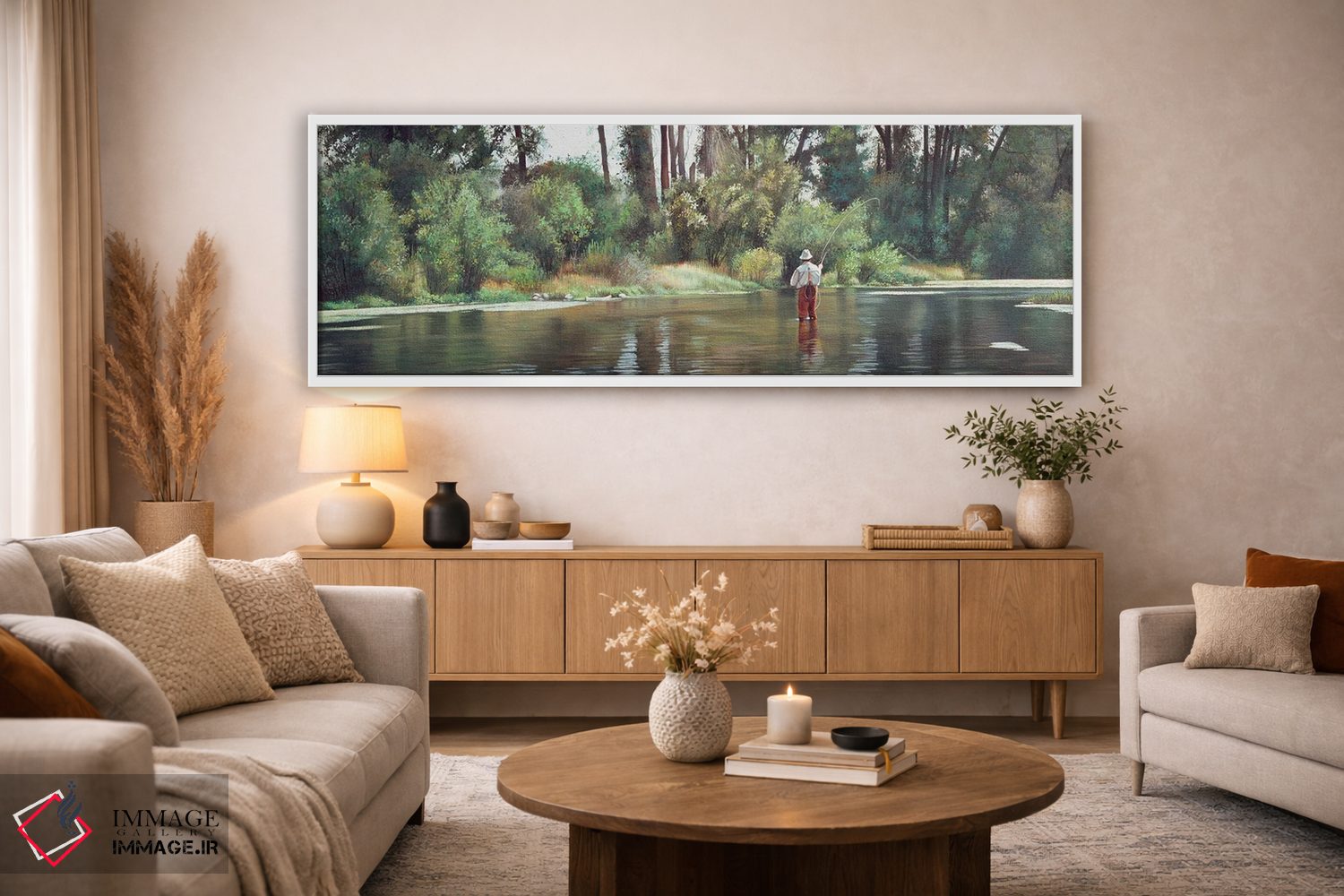 براساس پالت گرم اثر، قاب بلوط روشن (چوبی) پیشنهاد اول است و استخوانی ملایم مکمل. برای سفارشهای پروژهای با ابعاد و قابهای اختصاصی با ایماژ در تماس باشید.