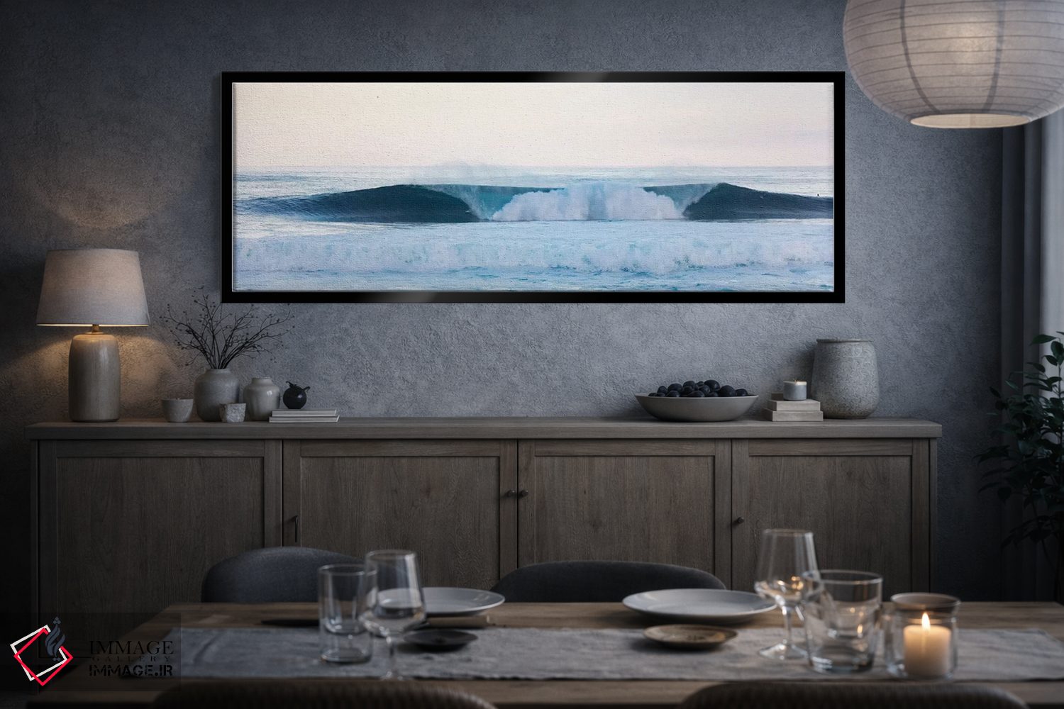 براساس پالت سرد اثر، قاب سفید مات (فریم باریک) پیشنهاد اول است و نقرهای برسخورده (متالیک) مکمل. برای سفارشهای پروژهای با ابعاد و قابهای اختصاصی با ایماژ در تماس باشید.