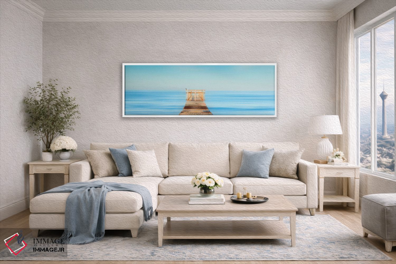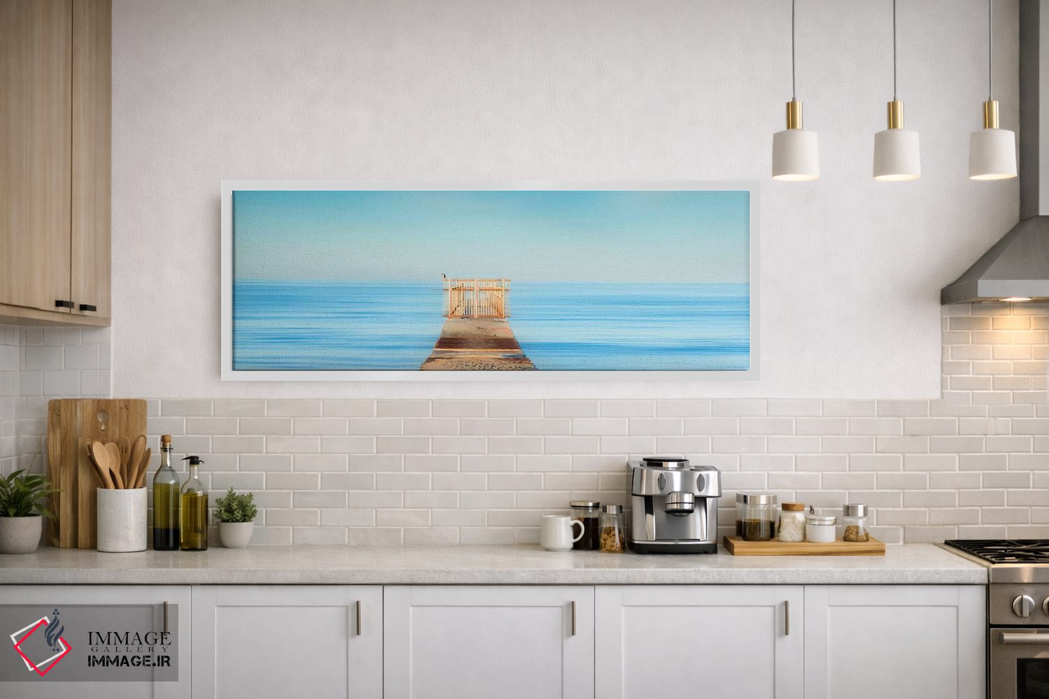 «دروازه پاستلی» اثرِ «شان دیوی» با حالوهوای این اثر و لحنِ دکور ساحلی، فضا را روشنتر و سبکتر نشان میدهد—مناسبِ نشیمنهای آفتابگیر.