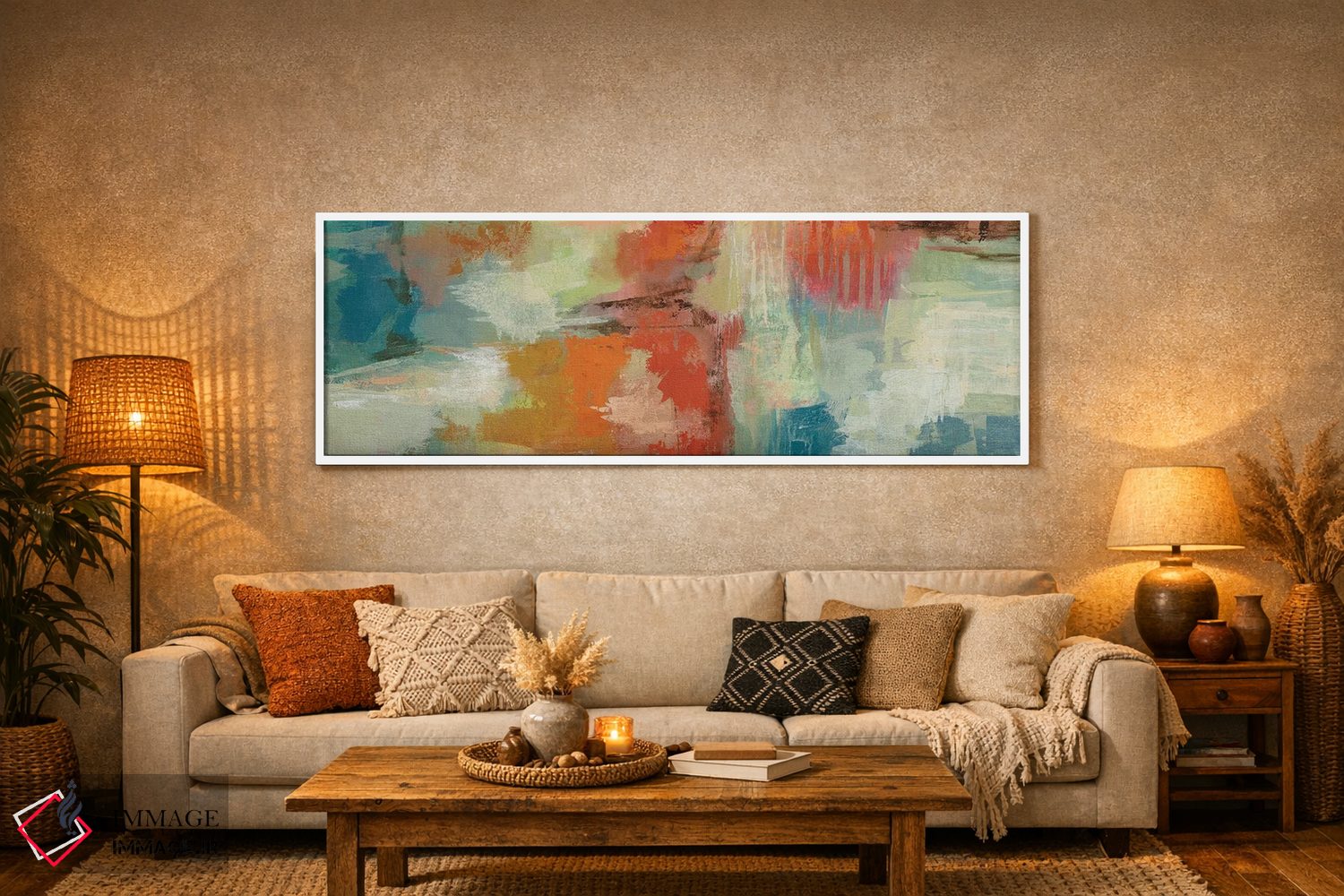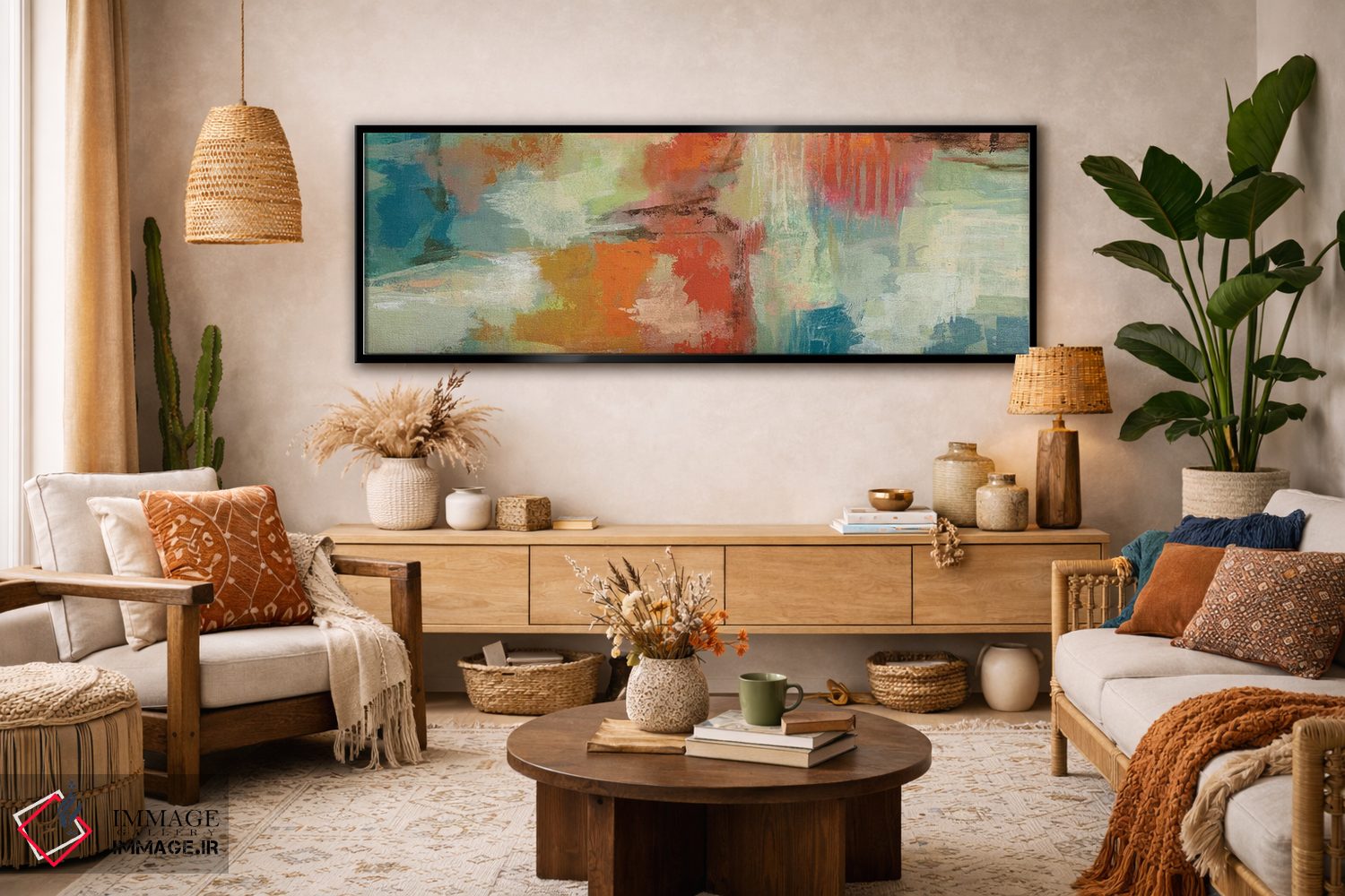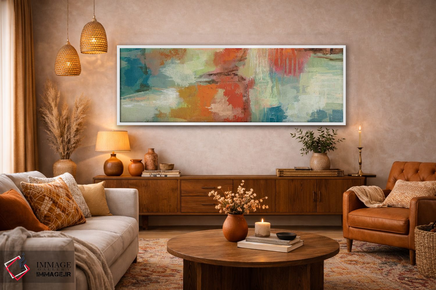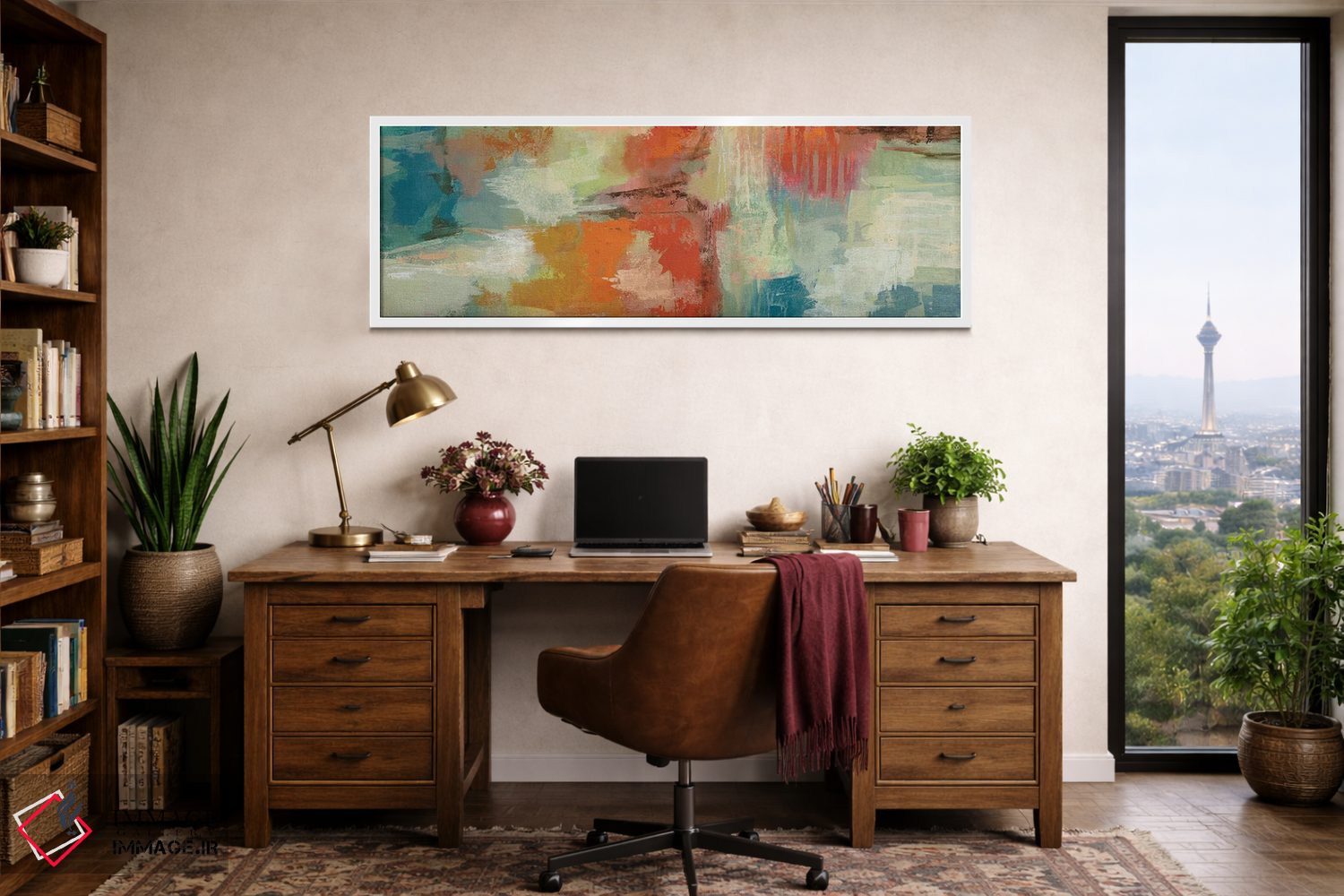 براساس پالت ترکیبی اثر، قاب تیک گرم (چوبی) پیشنهاد اول است و مشکی مات (فریم متوسط) مکمل. برای سفارشهای پروژهای با ابعاد و قابهای اختصاصی با ایماژ در تماس باشید.