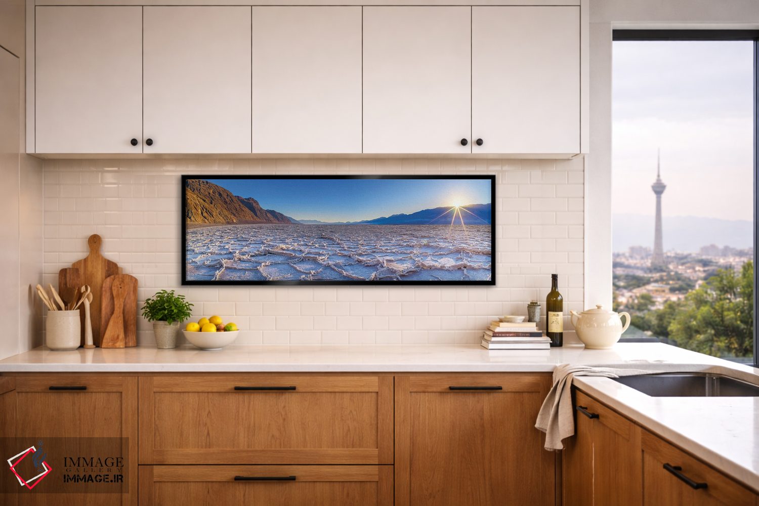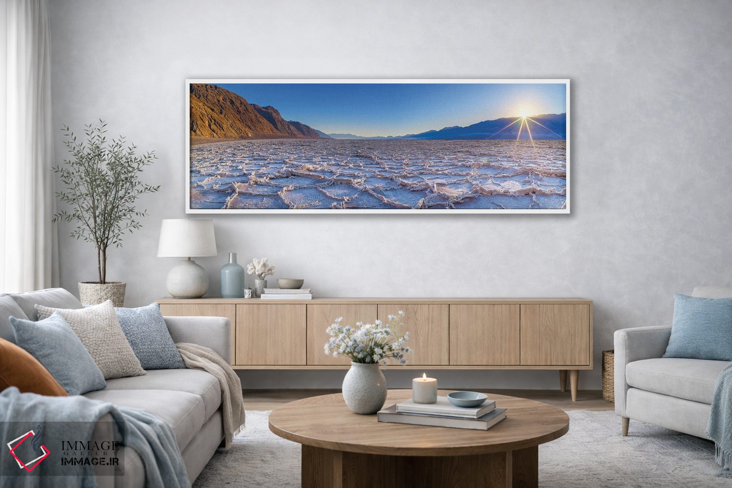 در نگاه اول، «غروب حوضه بدواتر، دره مرگ» اثرِ «سوزانه کرمر» ریتم فضا را منظم میکند؛ برای نشیمنهای صمیمی و پذیراییهای شیک پیشنهاد میشود. در چیدمانهای مختلف، هماهنگپذیر و انعطافدار است.