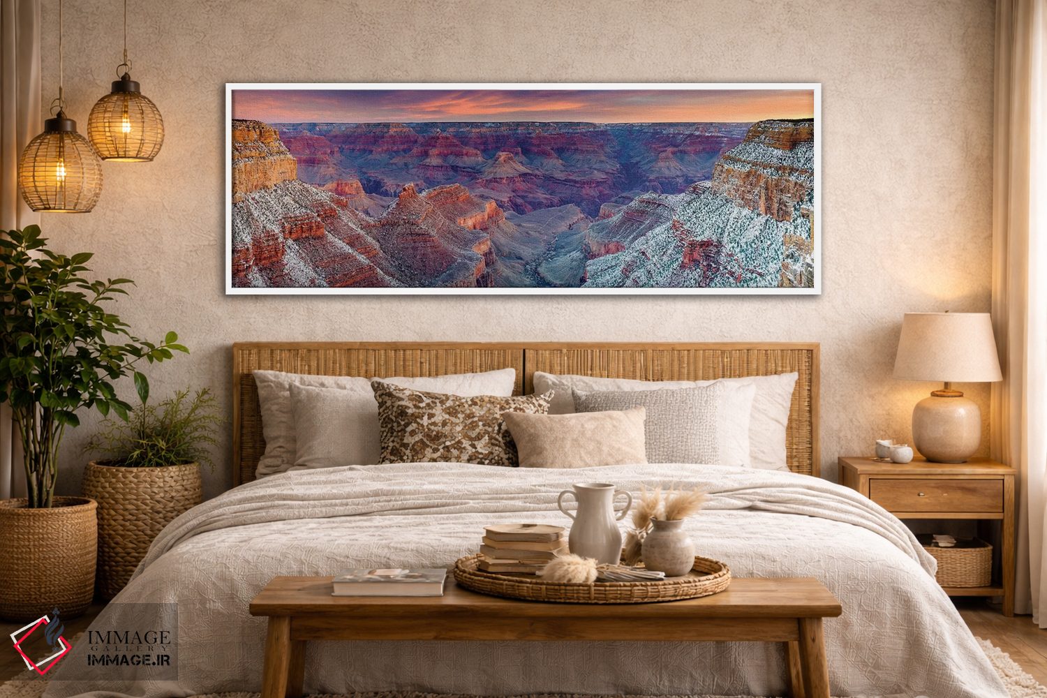 بوم گالری ایماژ نسخهی چیدماناتیوِ حرفهای از یک اثر هنری است؛ روی کنواس سفیدِ یکدست و بدون اسید با چاپ هنریِ استاندارد جیکلی برای بازآفرینی حرفهای با رنگدانههای آرشیوی و سیستم رنگ دقیق؛ حس نهایی نزدیکتر به ارائهی گالریوار است؛ نه صرفاً یک تصویر. تابلو پس از آمادهسازی روی کلاف کشیده میشود و نصب آن ساده و بیدردسر است.