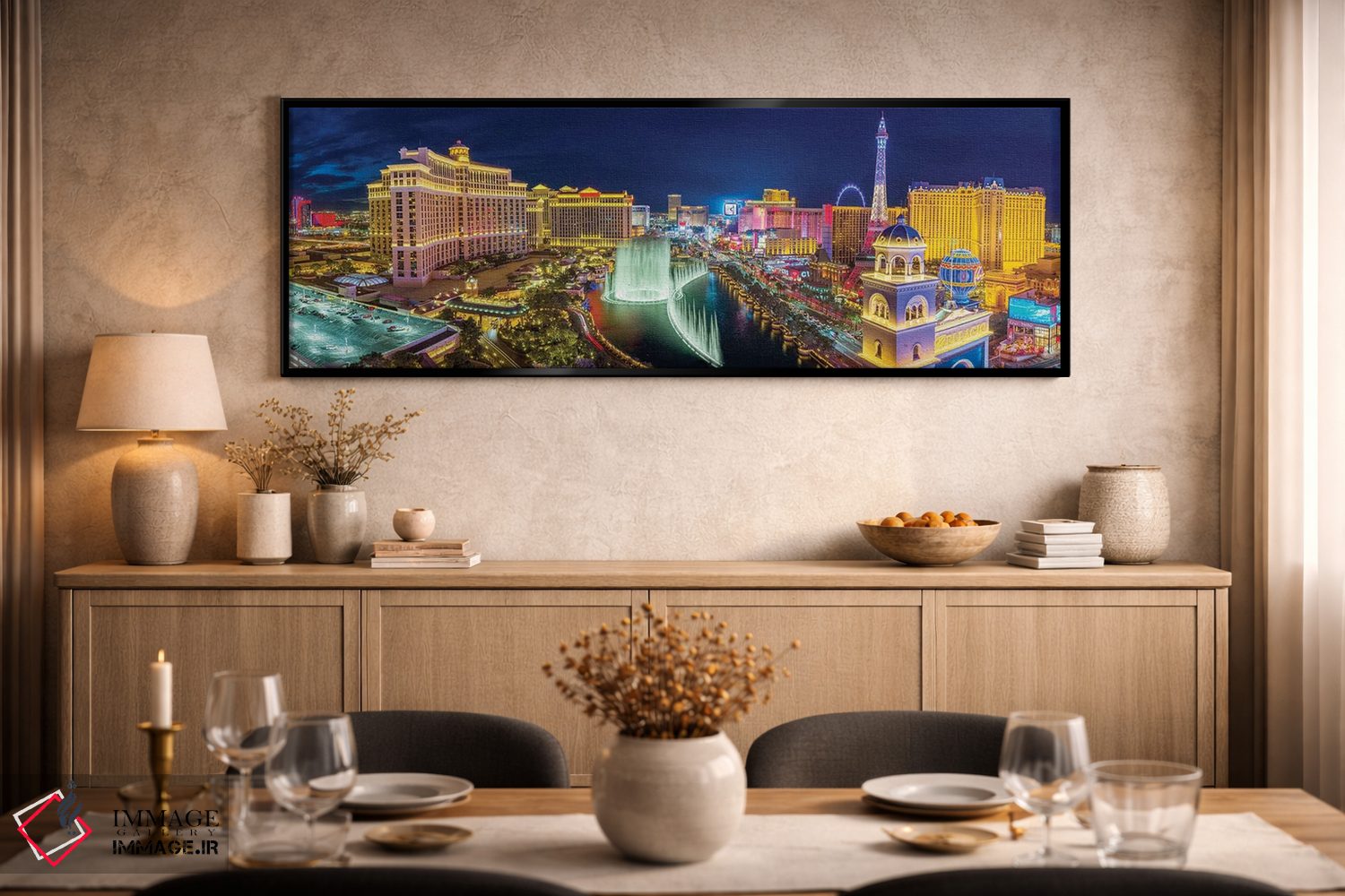 اگر اهل «کم اما درست» هستید، «نمای پانوراما از فوارههای لاس وگاس، نوادا» اثرِ «سوزانه کرمر» بین نور و رنگ، تعادل خوشنشینی میسازد؛ برای دیوار بالای کنسول یا شومینه پیشنهاد میشود. هم از دور چشمگیر است و هم از نزدیک پرداخت دارد.
