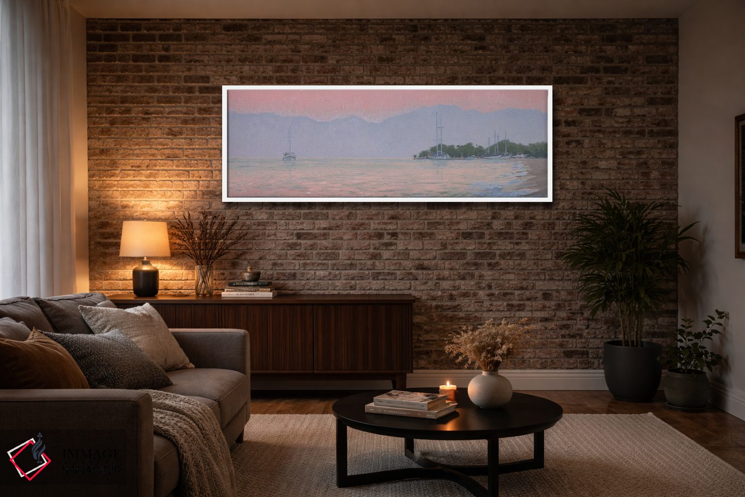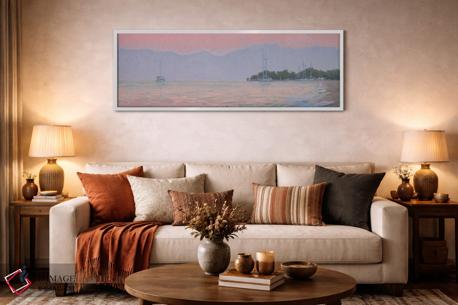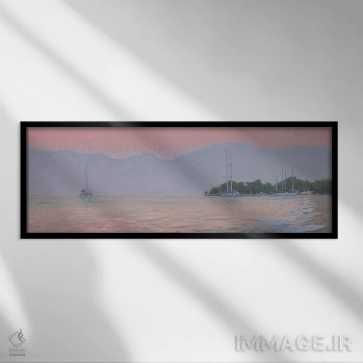 «غروب بر فراز دریا» اثرِ «سایمون کوژین» ترکیببندی متعادل دارد و به دیوار وقار میدهد؛ بدون اینکه فضا را سنگین کند.