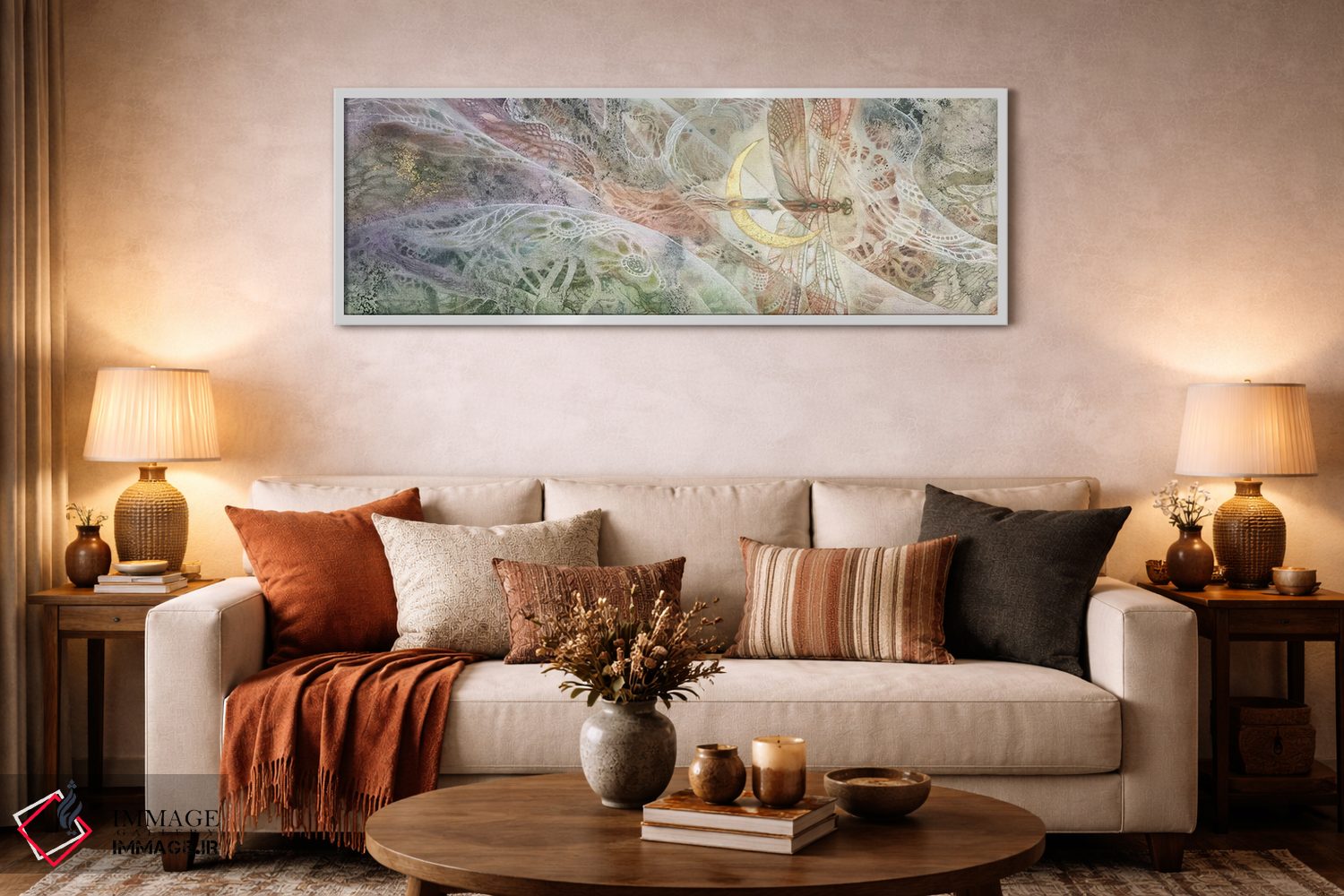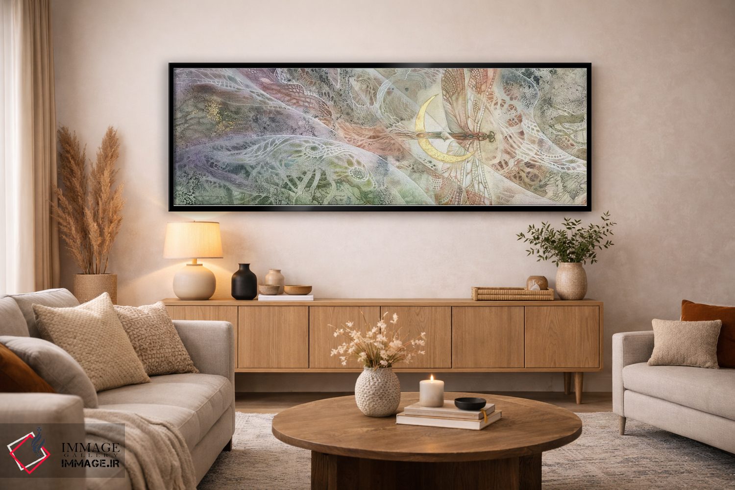 براساس پالت گرم اثر، قاب بلوط روشن (چوبی) پیشنهاد اول است و استخوانی ملایم مکمل. برای سفارشهای پروژهای با ابعاد و قابهای اختصاصی با ایماژ در تماس باشید.