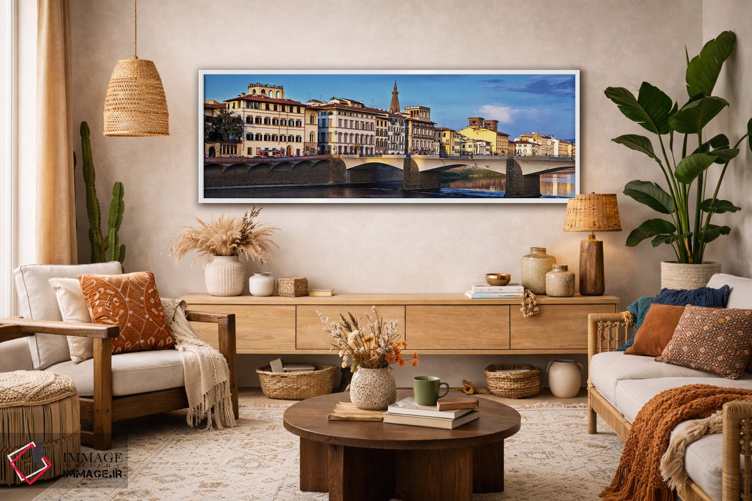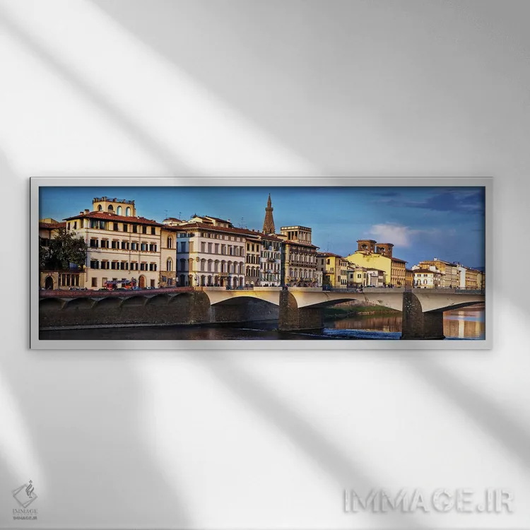 «پل پونته وکیو در گرگ و میش (فلورانس)» اثرِ «سوزان ریچی» میتواند جلوهٔ دیوار را منسجمتر کند؛ برای کنار کتابخانه یا میز کار پیشنهاد میشود. به دیوار حس «تمامشده» میدهد.