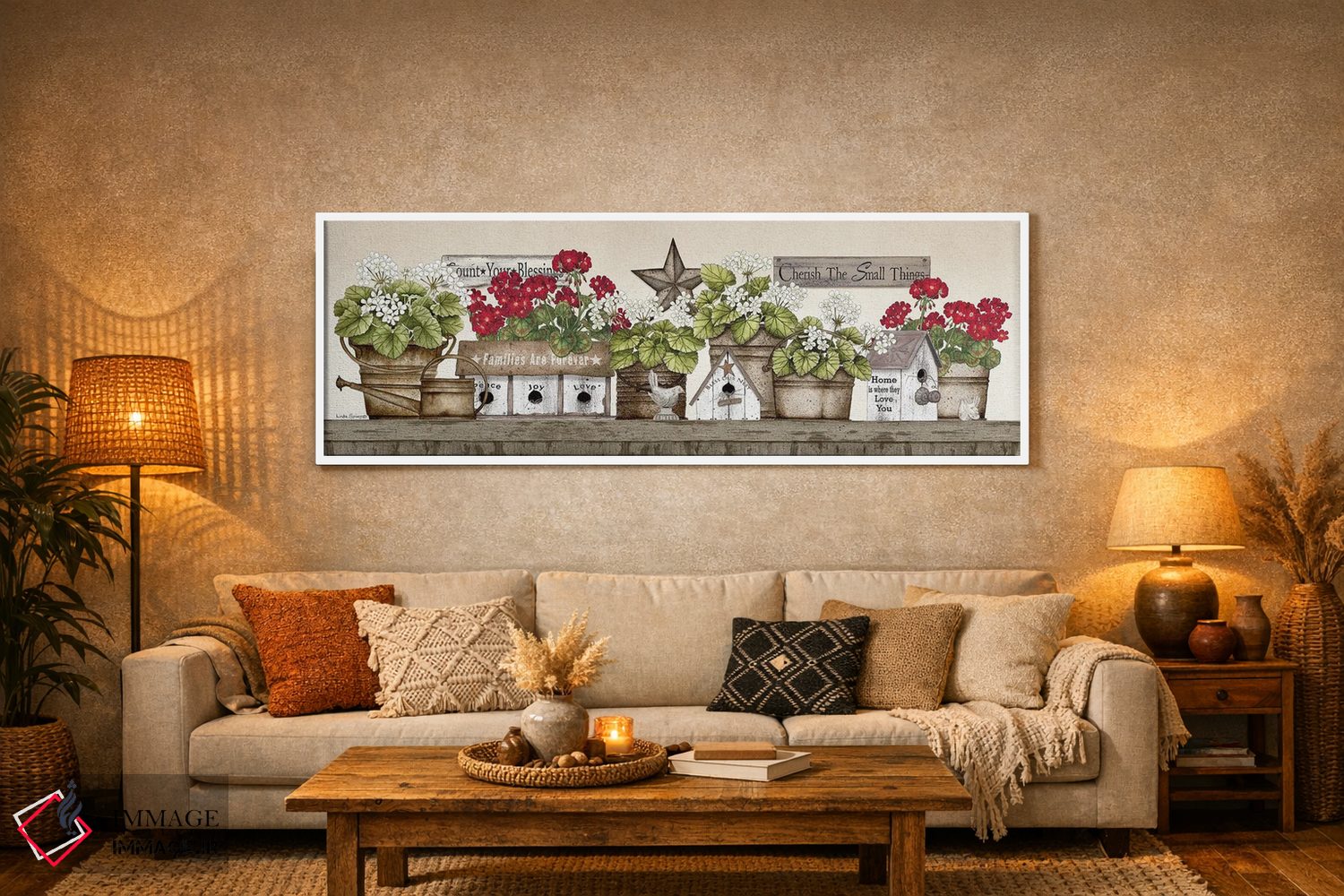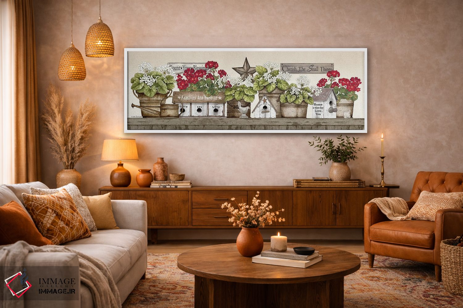 تابلو دکوراتیو طاقچه شمعدانی اثر لیندا اسپایوی - نمای روبه‌رو روی دیوار