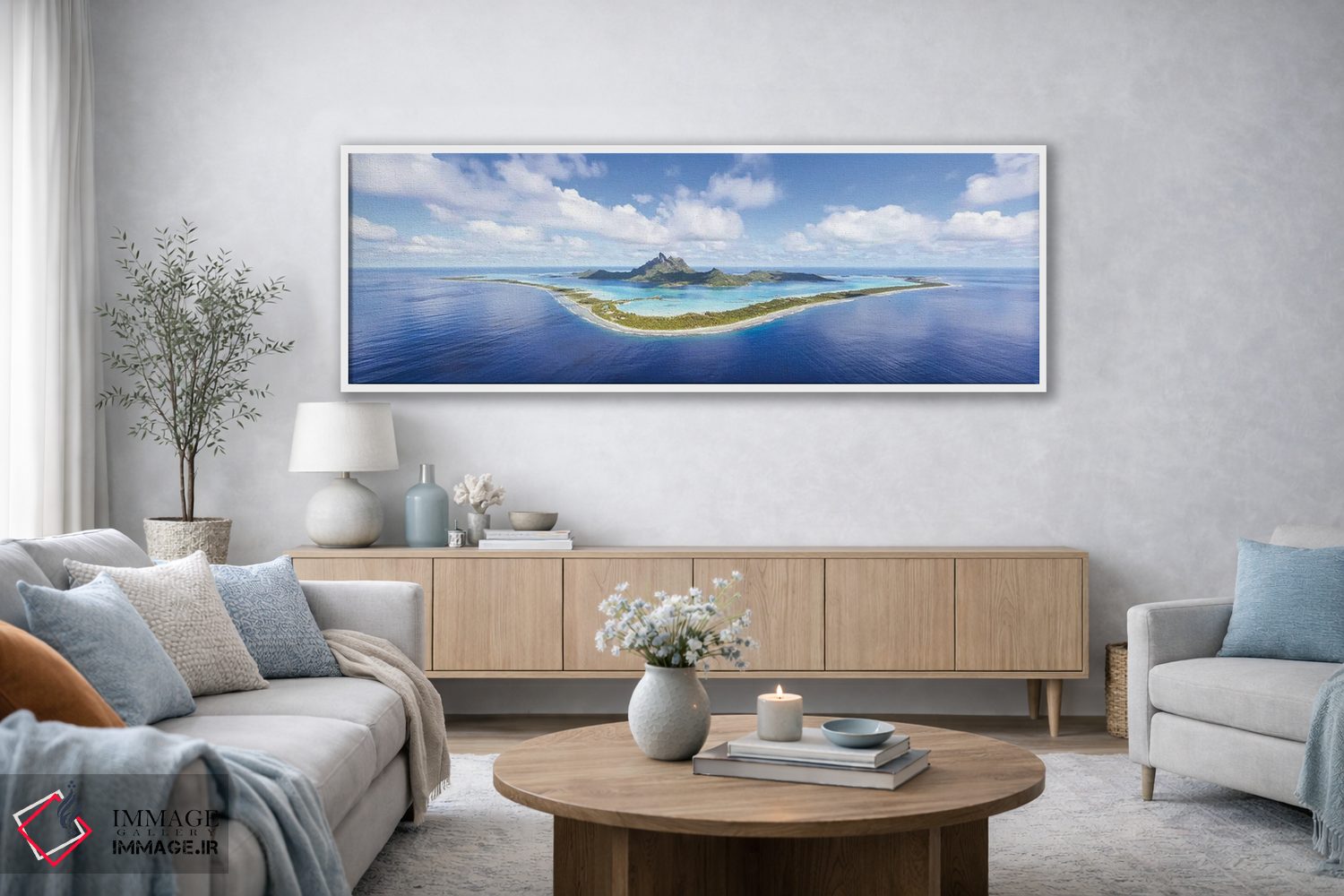 وقتی چیدمان را با دقت میچینید، «Bora Bora، پانورامای هوایی بورا» اثرِ «ماتئو کولومبو» بین نور و رنگ، تعادل خوشنشینی میسازد؛ برای کافهها و فضاهای عمومی کوچک پیشنهاد میشود. به فضا حس «گالری خانگی» میدهد، بدون اینکه اغراق کند.
