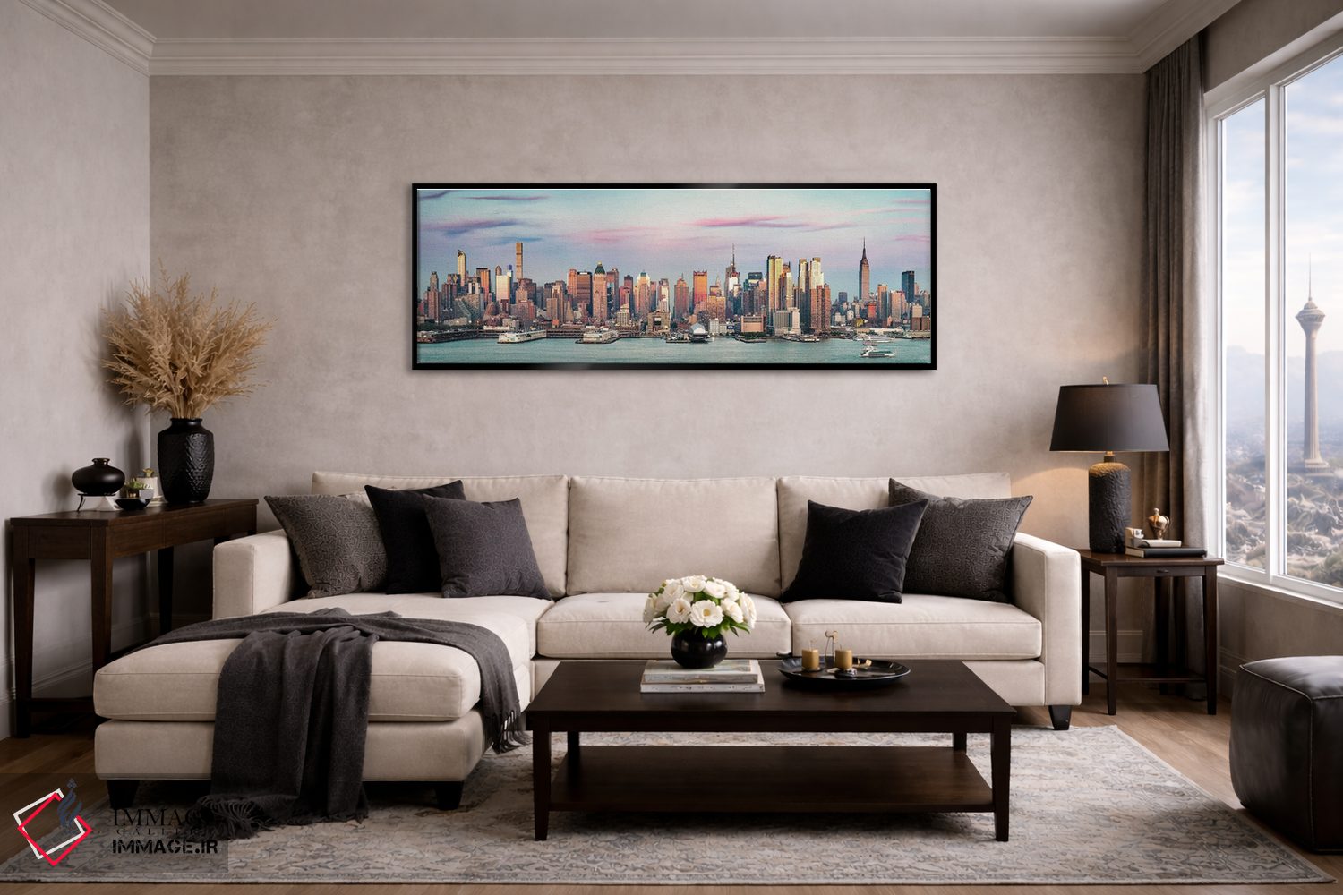 گاهی یک اثر کافیست تا فضا جمعوجور شود؛ «خط افق نیویورک در غروب» اثرِ «ماتئو کولومبو» روی دیوار، تمیز و دقیق دیده میشود؛ برای دیوارهای گالریوار و ترکیب چند اثر پیشنهاد میشود. با مبلمان خنثی، تضاد دلنشینی میسازد.
