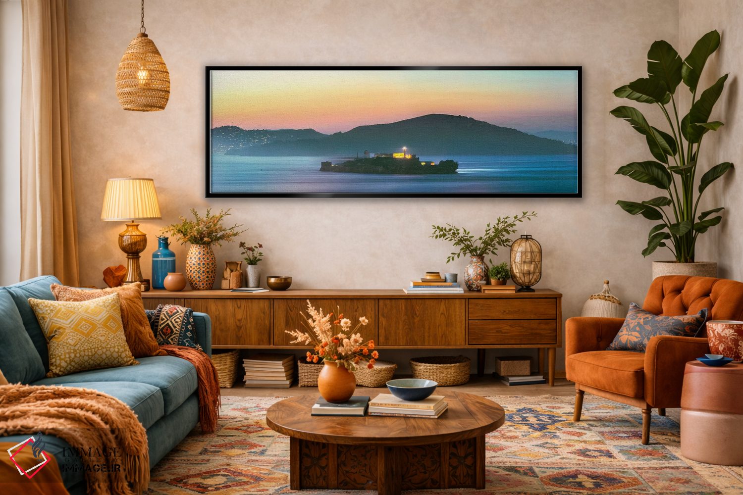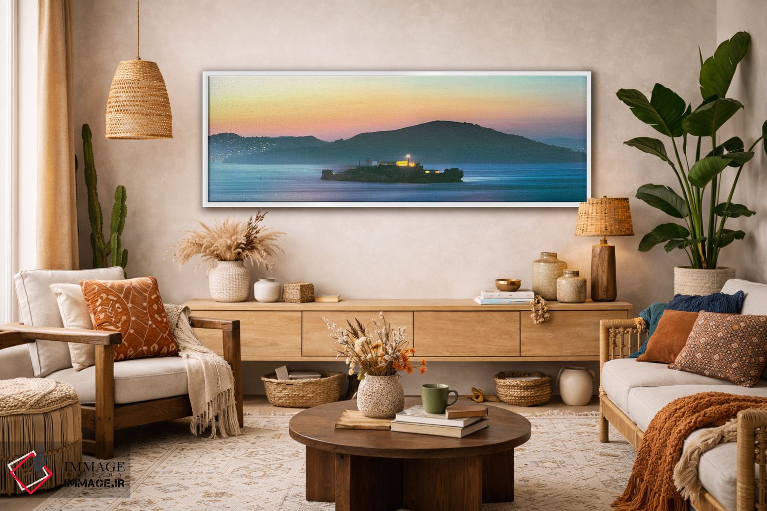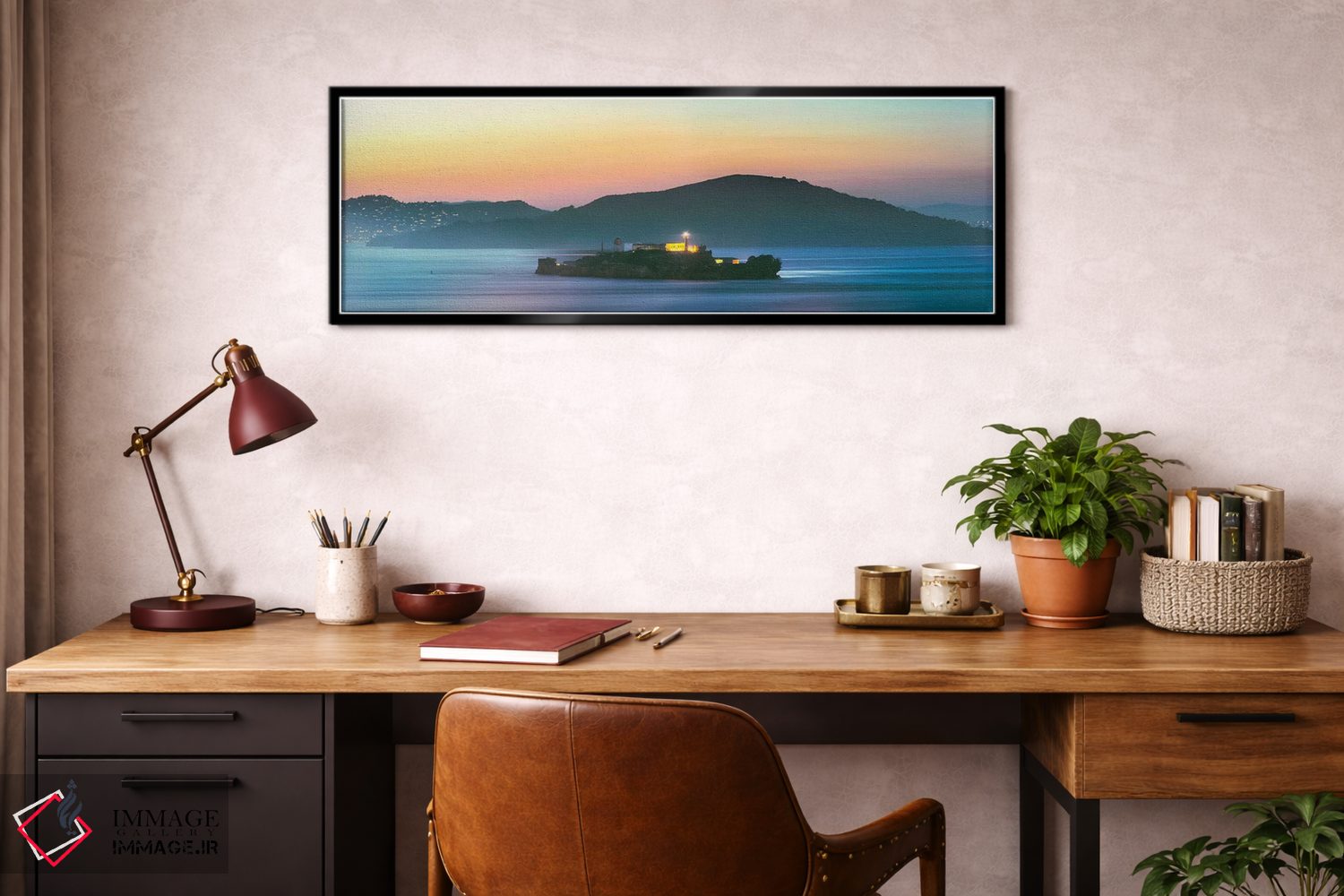 «پانورامای جزیره آلکاتراز» اثرِ «ماتئو کولومبو» انتخابیست برای زمانی که جلوهٔ اتاق را یک پله حرفهایتر میکند؛ برای راهروها و ورودیهای مینیمال انتخابی عالی است. این تابلو میتواند شروعِ خوبی برای یک دیوار گالری باشد.