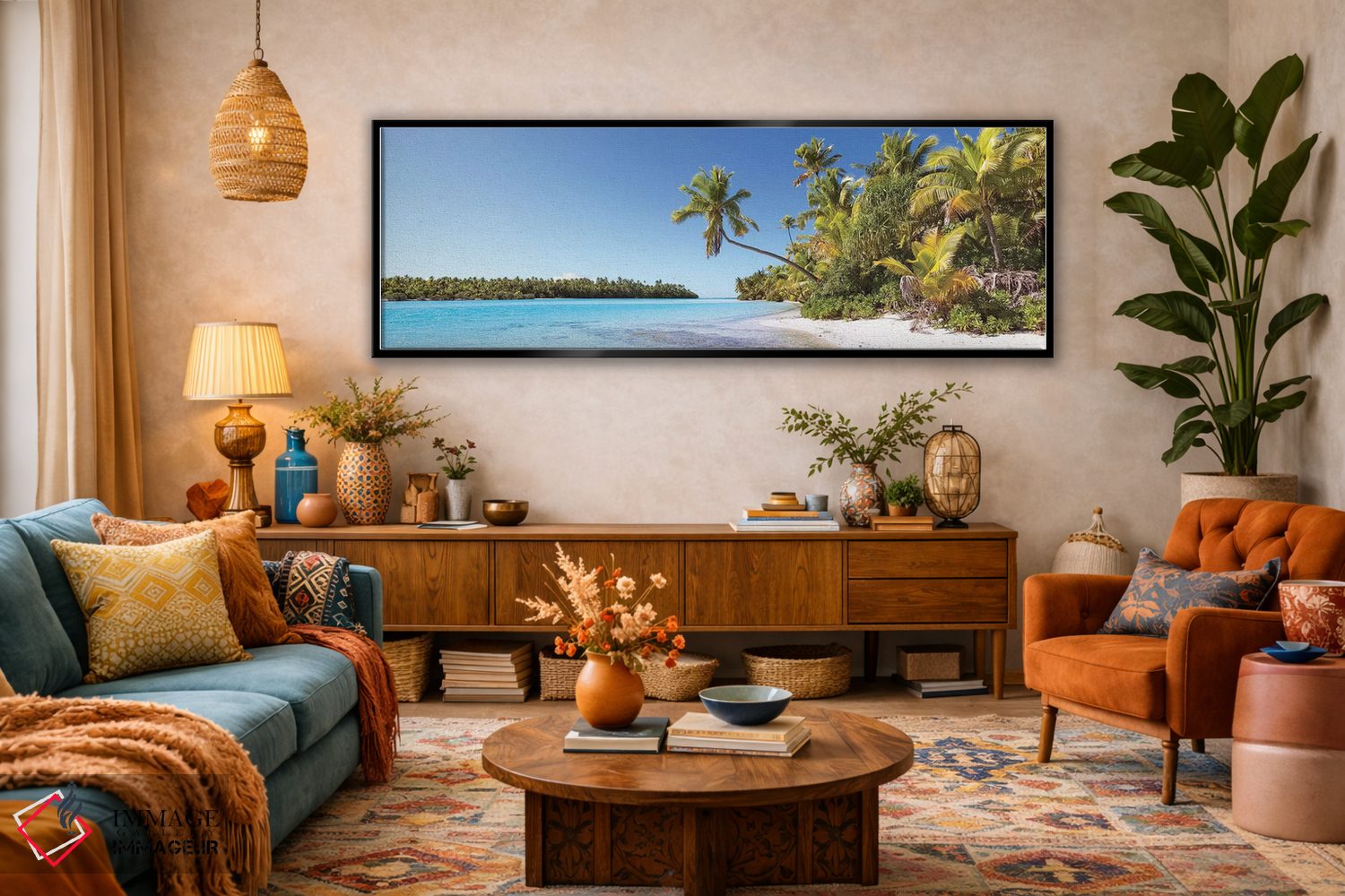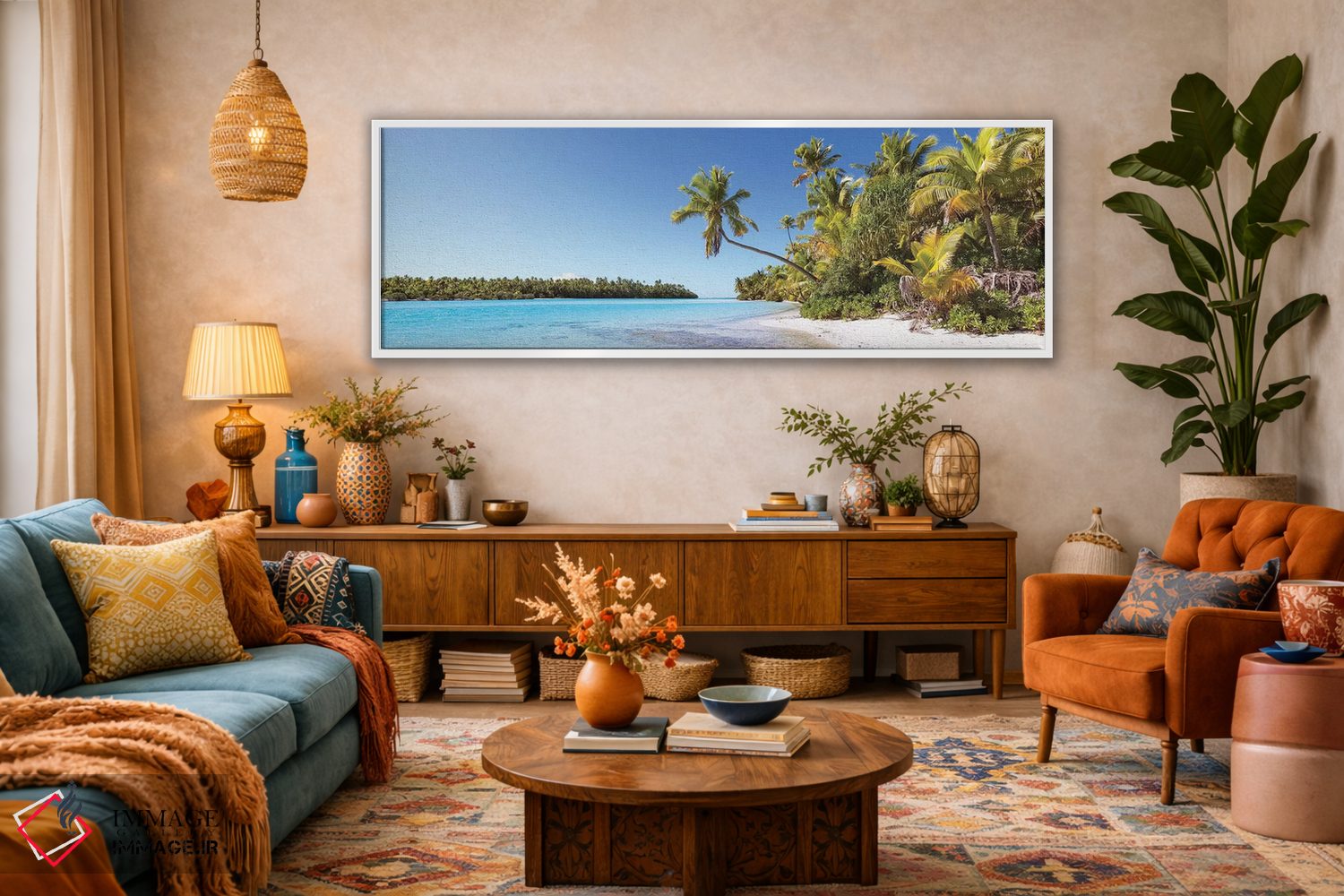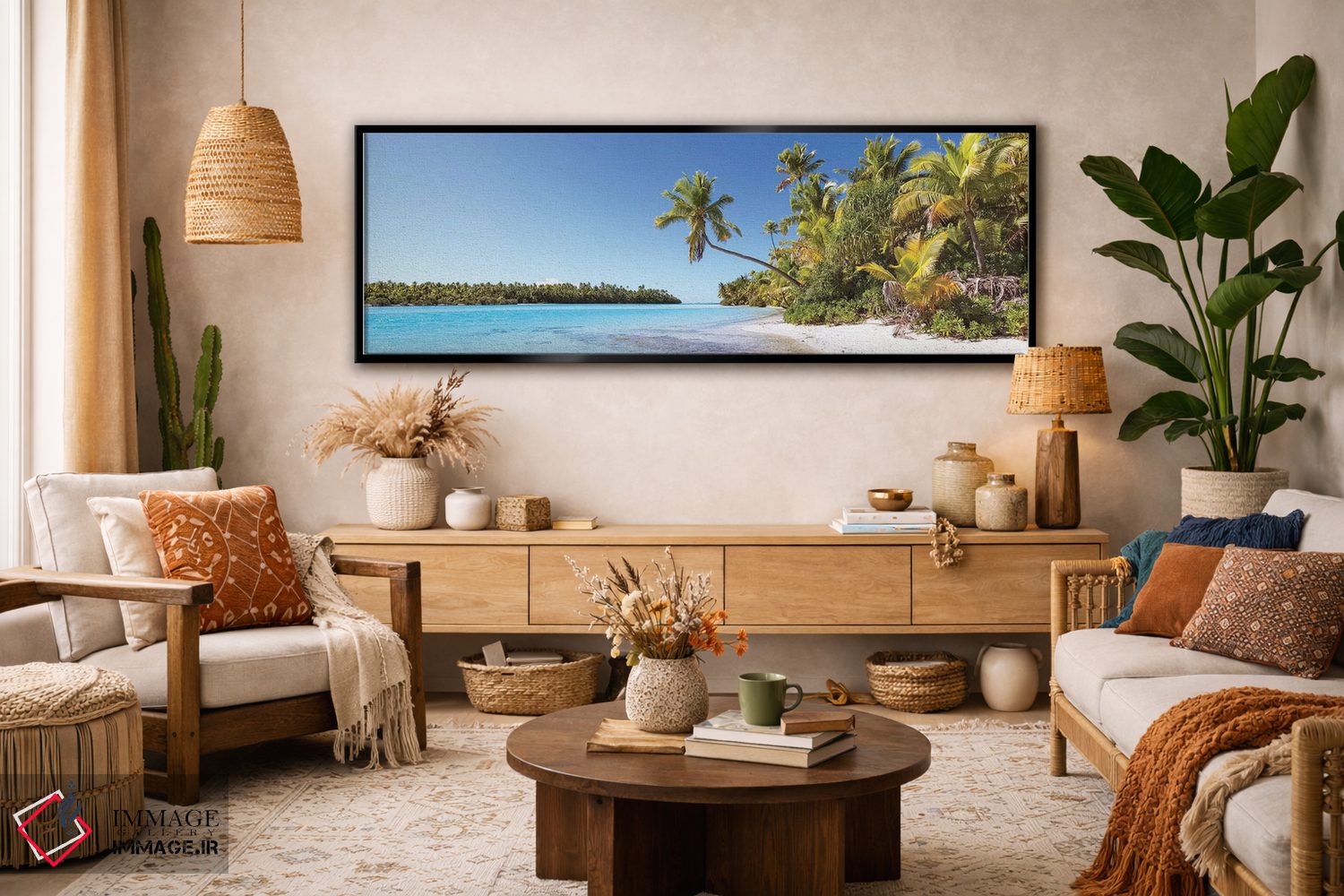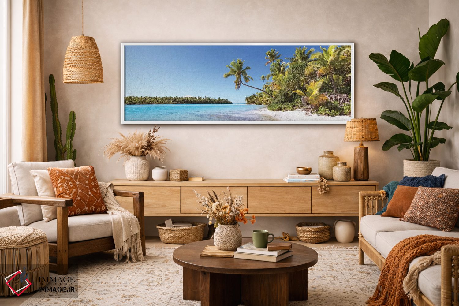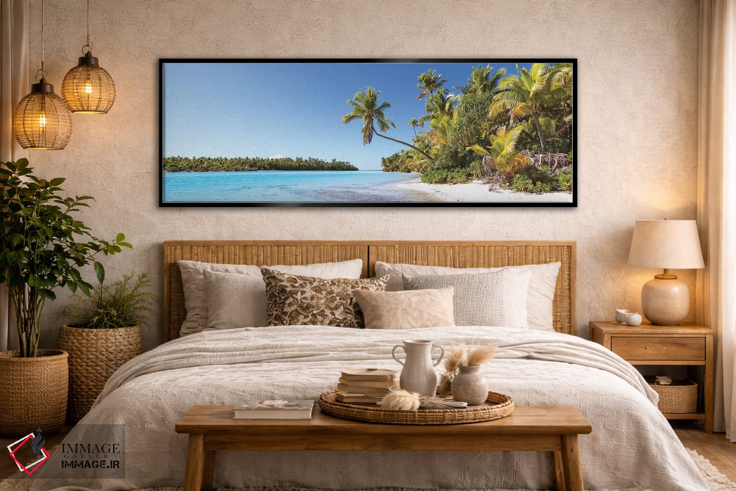 در نگاه اول، «Aitutaki، Cook Islands، نمای پانورامای جزیره وان فوت، آیتوتاکی، جزایر کوک» اثرِ «ماتئو کولومبو» جلوهٔ اتاق را یک پله حرفهایتر میکند؛ برای راهروها و ورودیهای مینیمال پیشنهاد میشود. برای هدیه دادن هم انتخابی محترمانه و امن است.