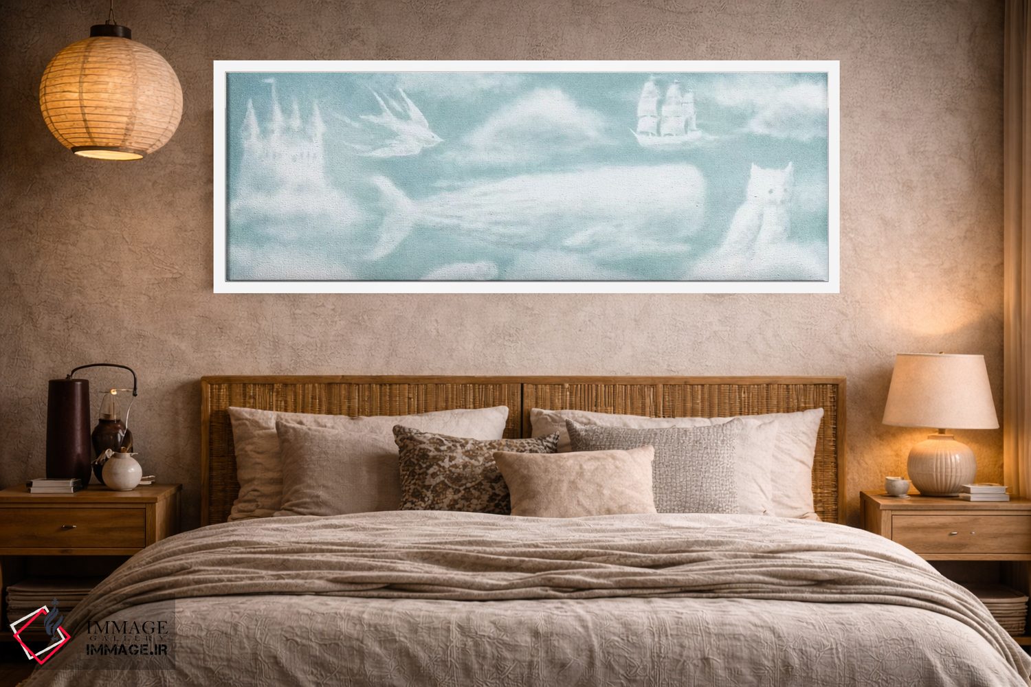 «آستر صحافی حیوانات ابری!» اثرِ «تری فن» میتواند چیدمان را از حالت پراکنده خارج کند؛ برای دکورهایی که بافت و جزئیات در آن مهم است پیشنهاد میشود. حضورش روی دیوار «مرتب» است؛ نه پر سر و صدا، نه بیاثر.