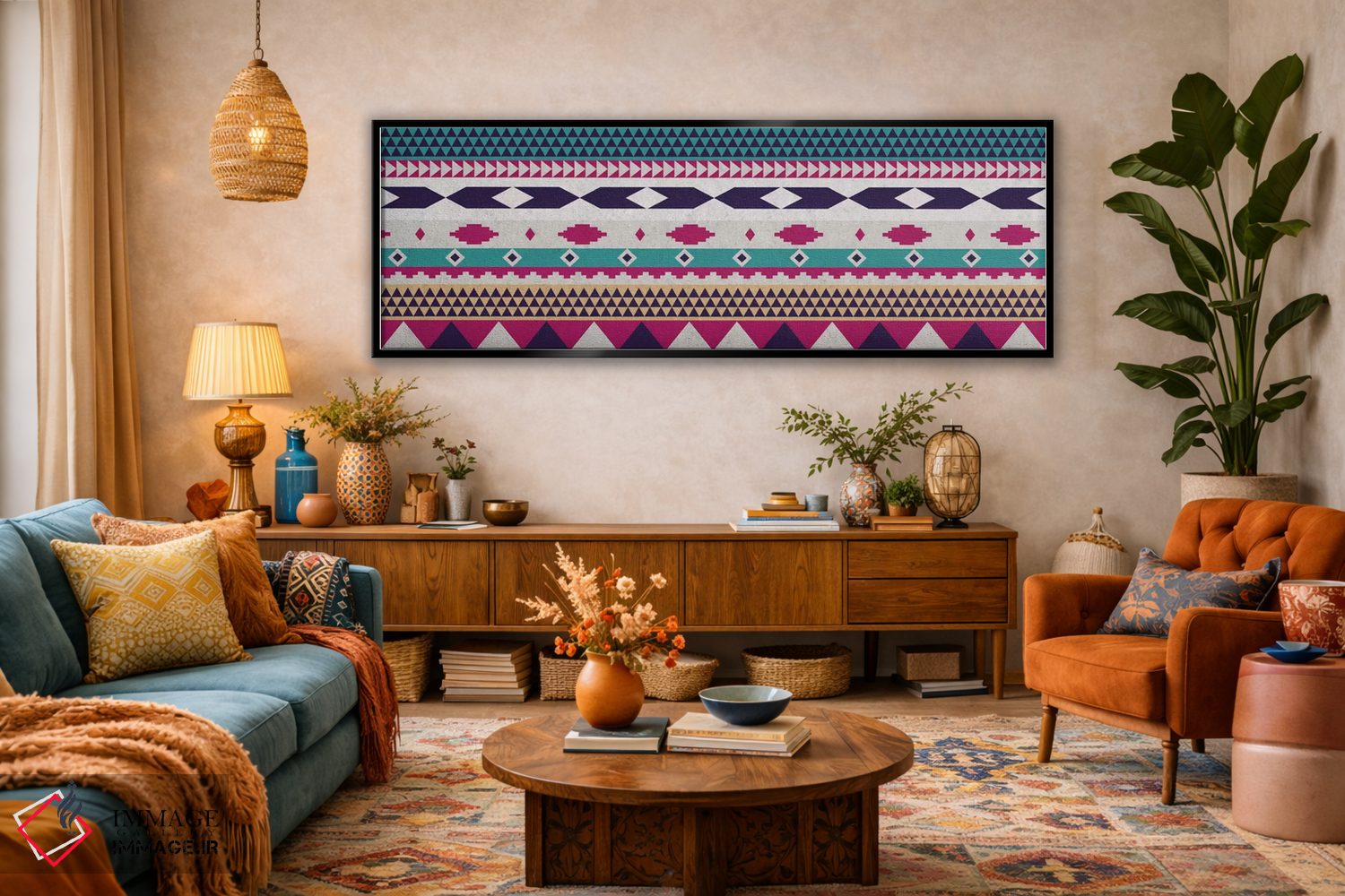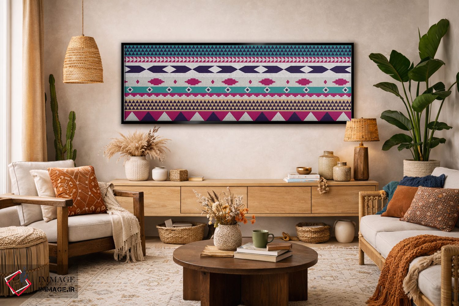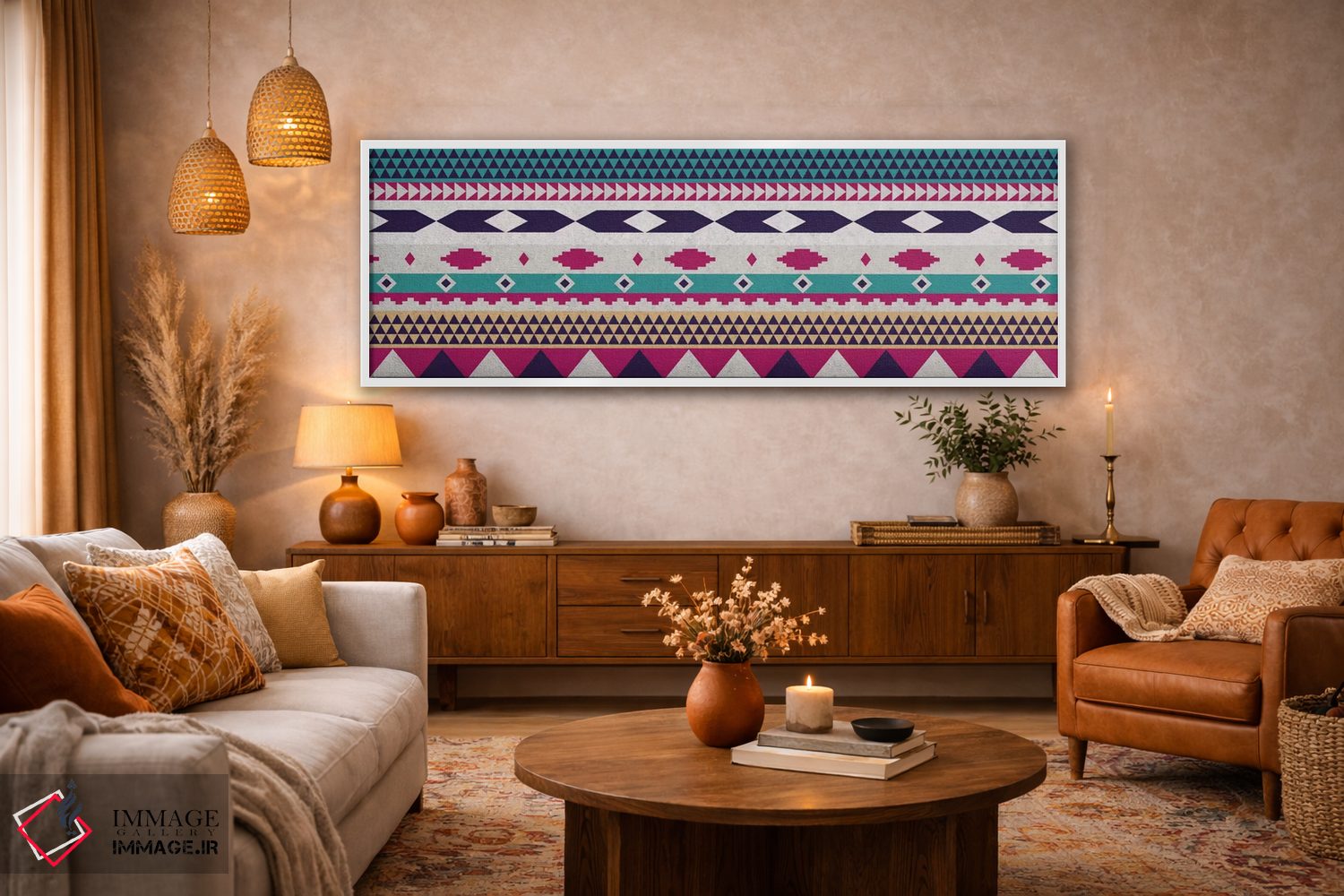 براساس پالت ترکیبی اثر، قاب تیک گرم (چوبی) پیشنهاد اول است و مشکی مات (فریم متوسط) مکمل. برای سفارشهای پروژهای با ابعاد و قابهای اختصاصی با ایماژ در تماس باشید.