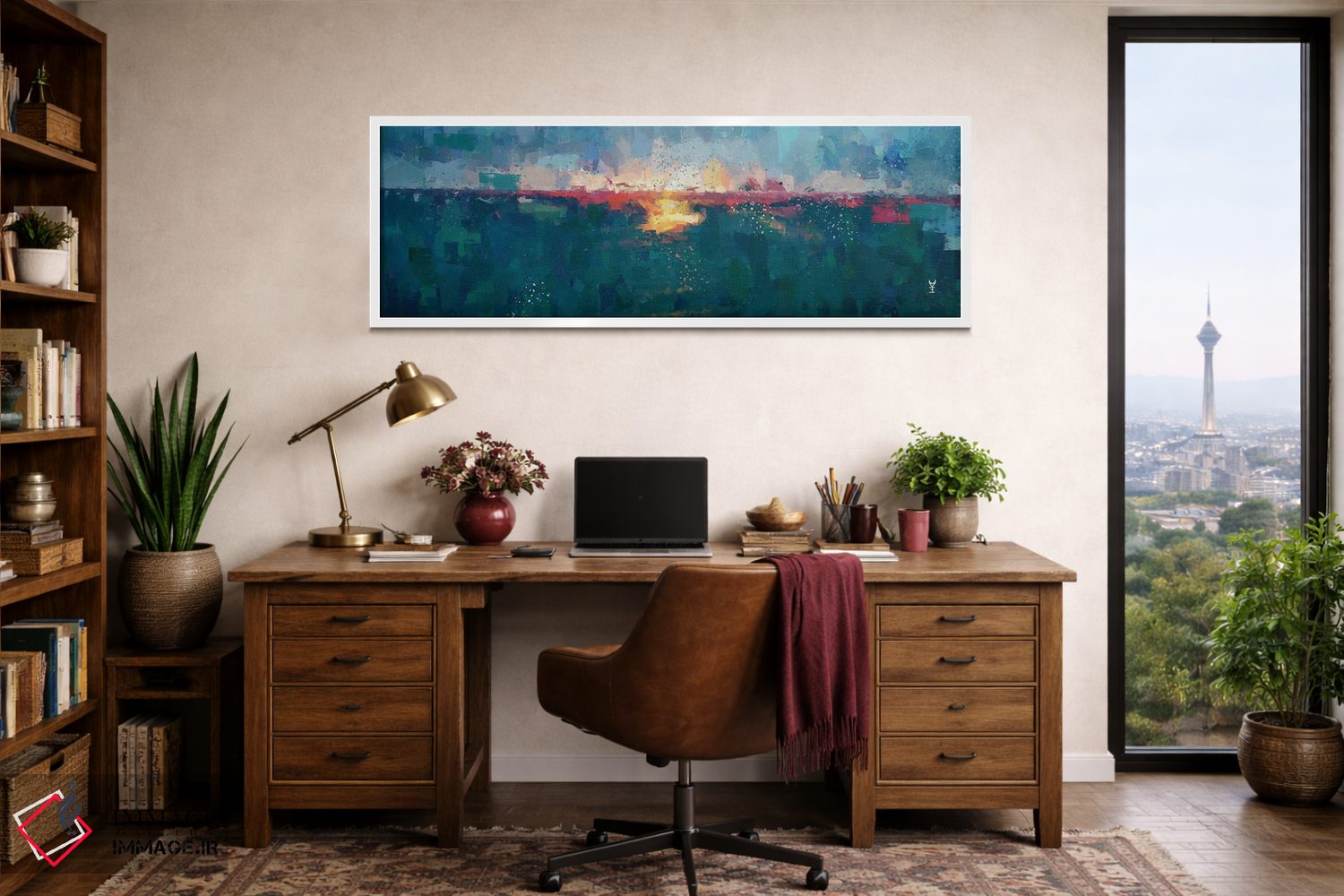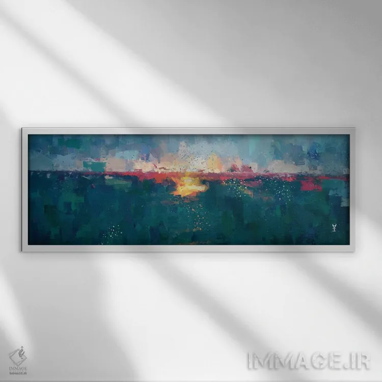 براساس پالت ترکیبی اثر، قاب تیک گرم (چوبی) پیشنهاد اول است و مشکی مات (فریم متوسط) مکمل. برای سفارشهای پروژهای با ابعاد و قابهای اختصاصی با ایماژ در تماس باشید.