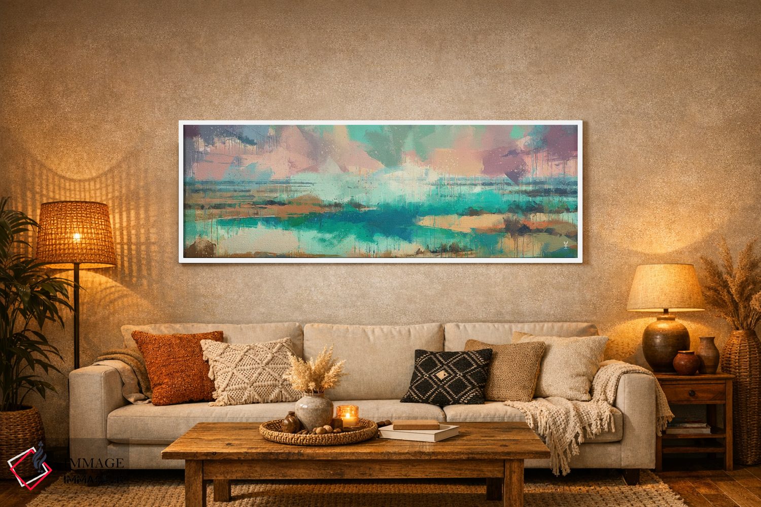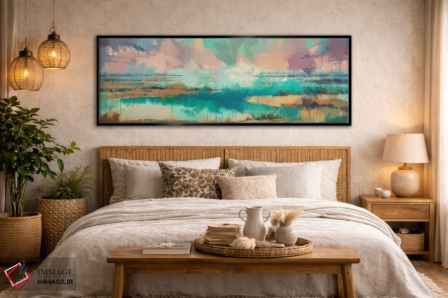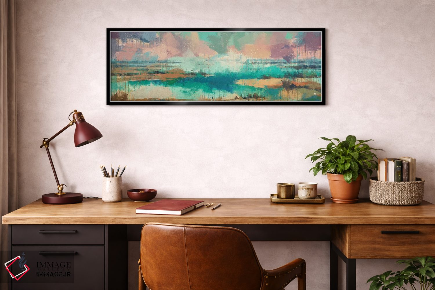 براساس پالت ترکیبی اثر، قاب تیک گرم (چوبی) پیشنهاد اول است و مشکی مات (فریم متوسط) مکمل. برای سفارشهای پروژهای با ابعاد و قابهای اختصاصی با ایماژ در تماس باشید.