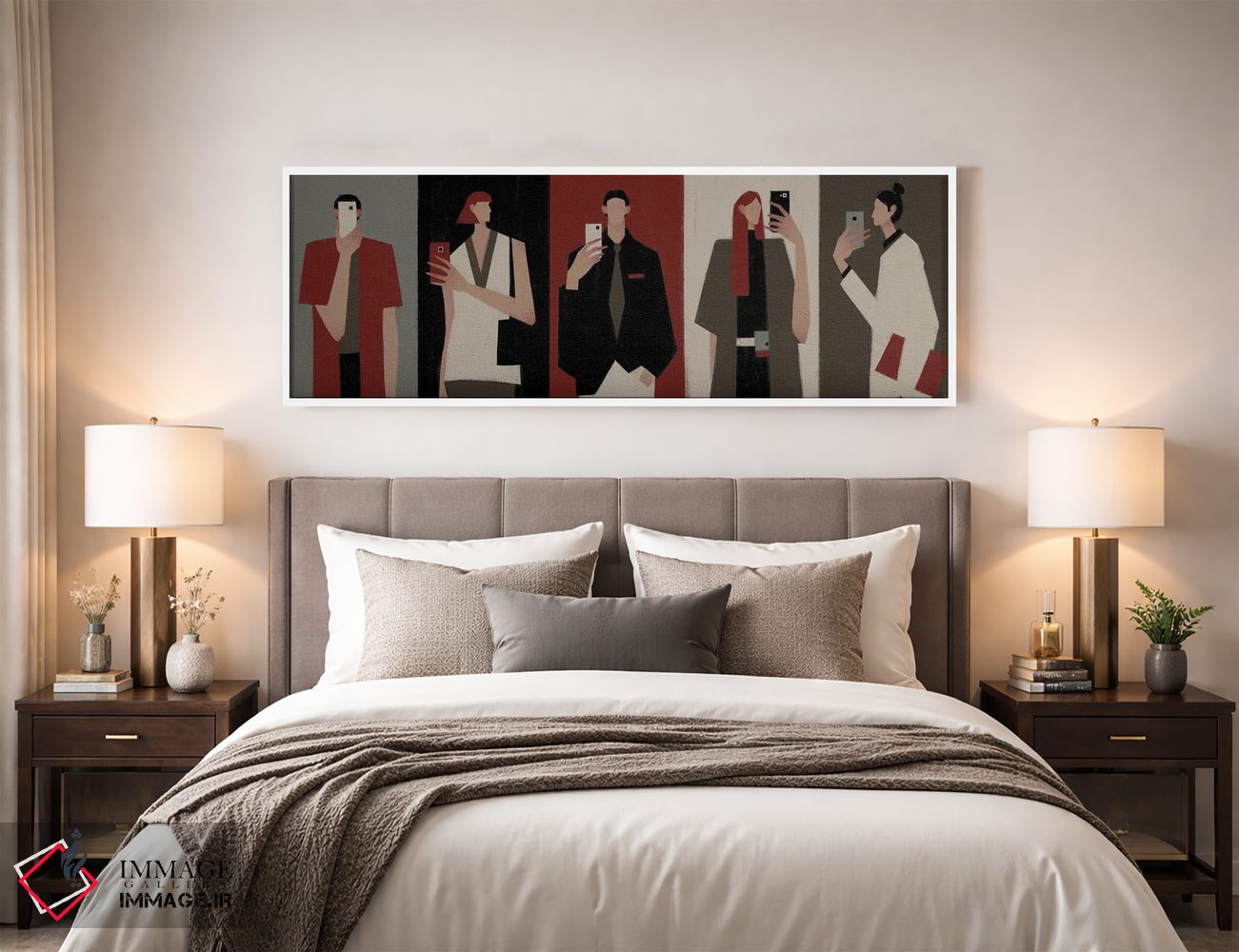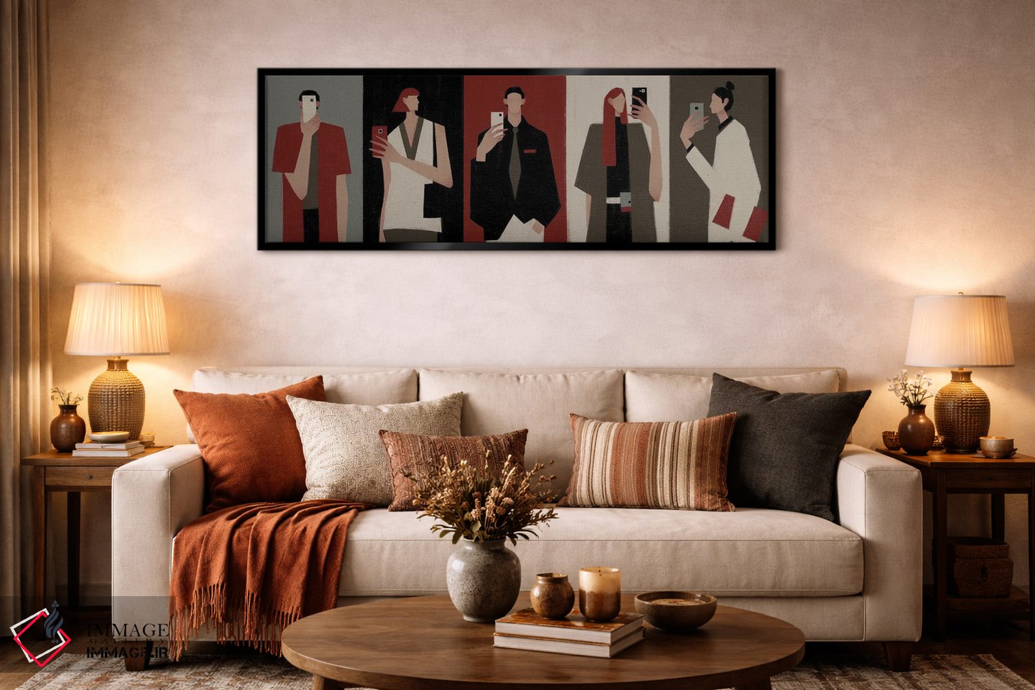 براساس پالت گرم اثر، قاب بلوط روشن (چوبی) پیشنهاد اول است و استخوانی ملایم مکمل. برای سفارشهای پروژهای با ابعاد و قابهای اختصاصی با ایماژ در تماس باشید.