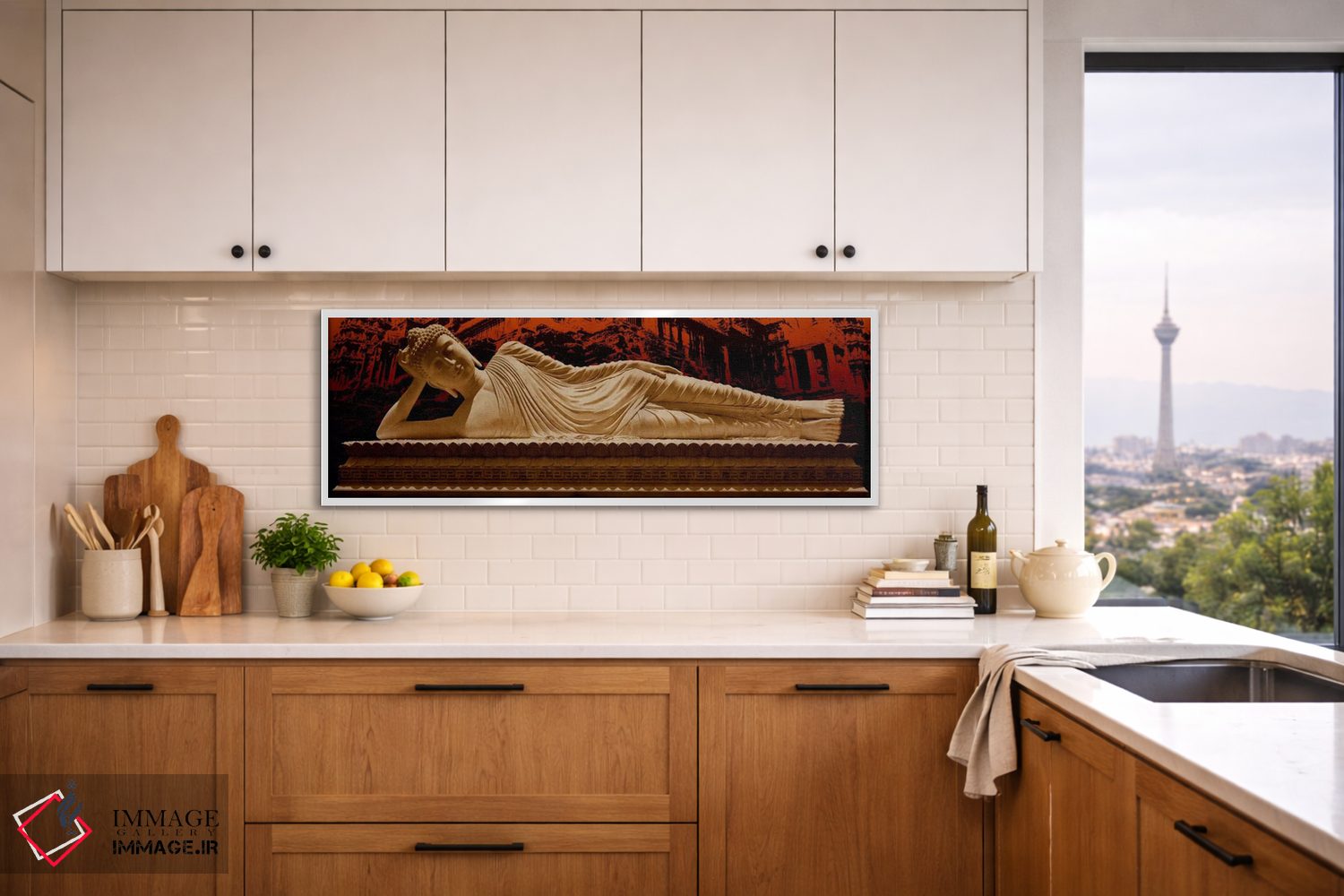 تابلو دکوراتیو بودای خوابیده در انگکور وات اثر فایو بای فایو کالکتیو - نمای قاب‌دار سفید