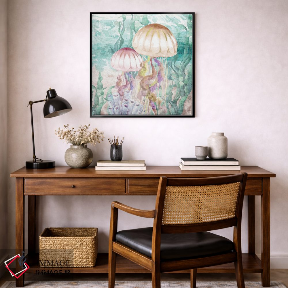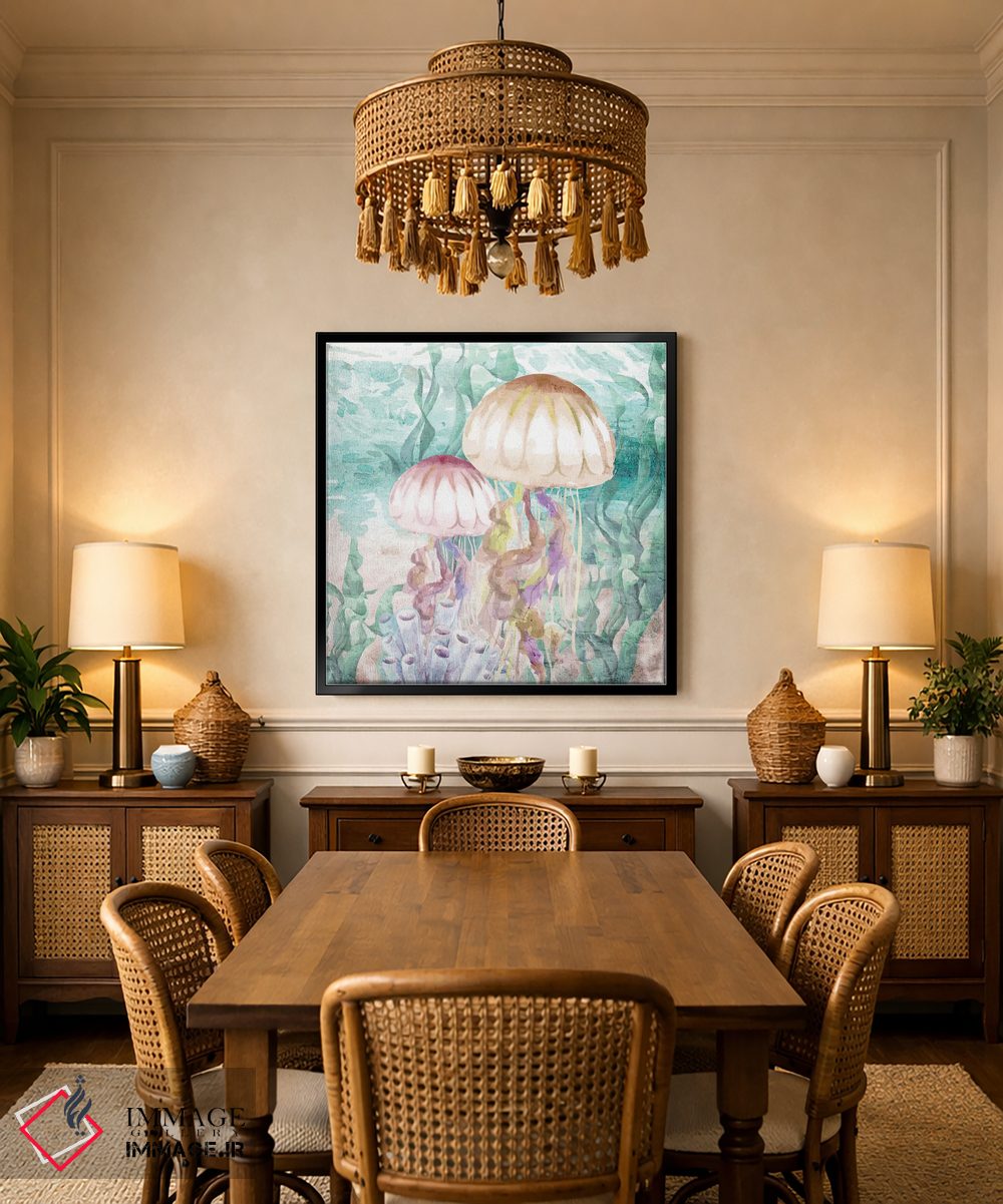 براساس پالت ترکیبی اثر، قاب تیک گرم (چوبی) پیشنهاد اول است و مشکی مات (فریم متوسط) مکمل. برای سفارشهای پروژهای با ابعاد و قابهای اختصاصی با ایماژ در تماس باشید.