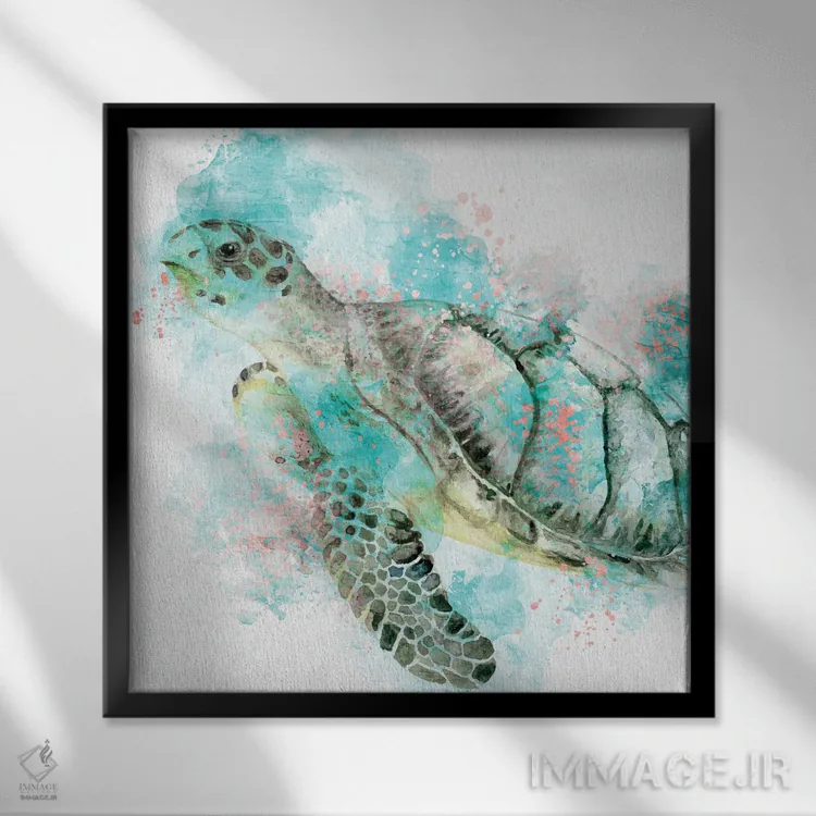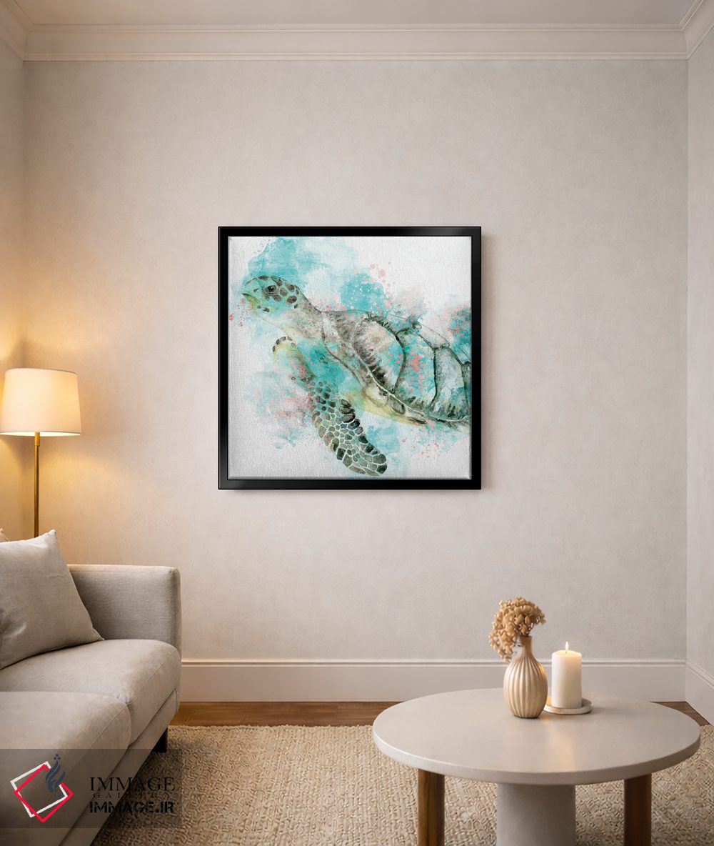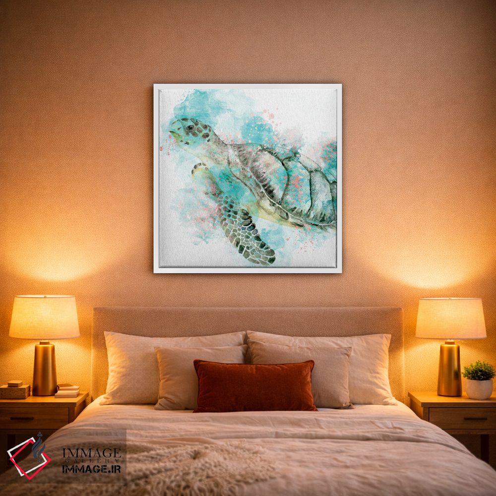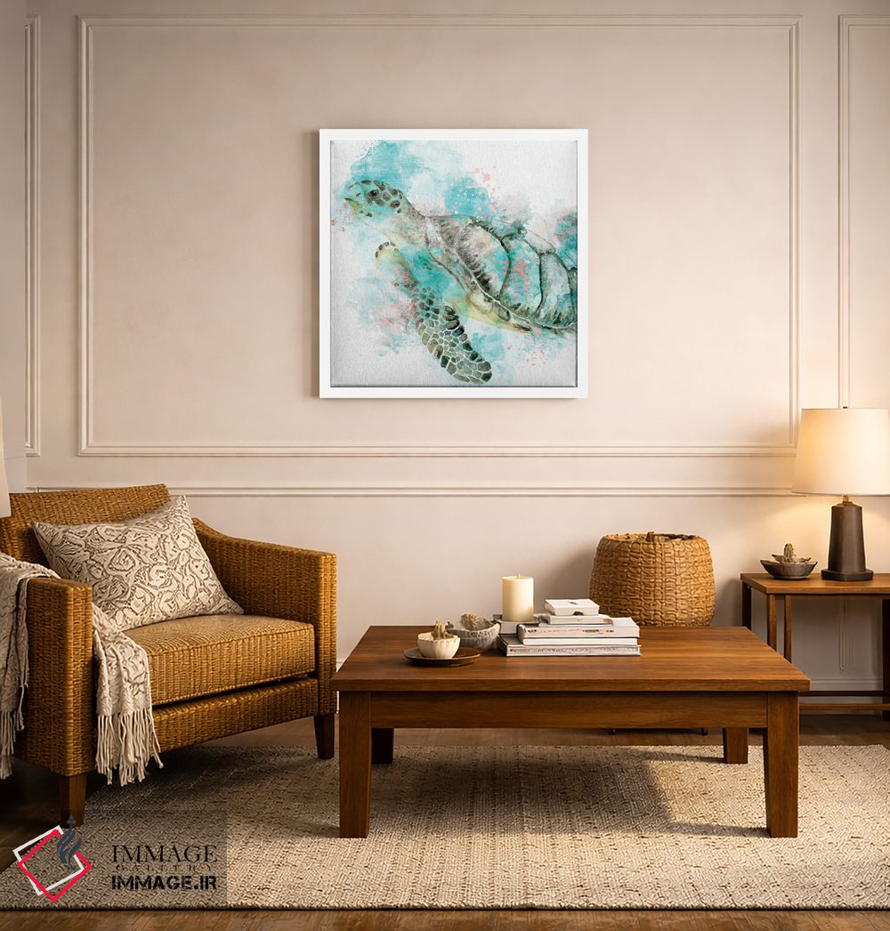 برای دکورهای صمیمی، «شنا کردن لاکپشت» اثرِ «کیمبرلی آلن» به دیوار، انرژیِ نرم و زنده میدهد؛ برای راهروها و ورودیهای گرم انتخابی خوشسلیقه است. هر بار نگاهش میکنید، یک جزئیات تازه به چشم میآید.