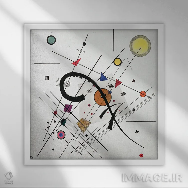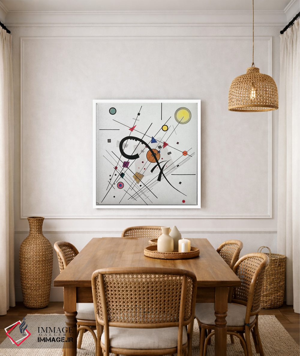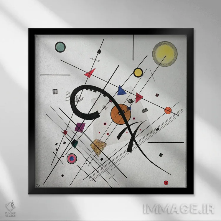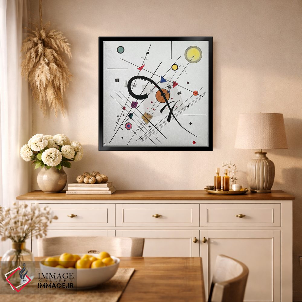 «1923، مربع خاکستری، ۱۹۲۳» اثرِ «واسیلی کانباورسکی (نقاش روس بنیانگذار انتزاعی)» بهخاطر فرمهای آزادش، در فضاهای خنثی بهتر دیده میشود و عمق بصری ایجاد میکند.