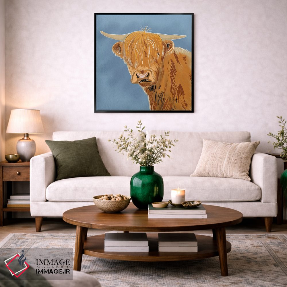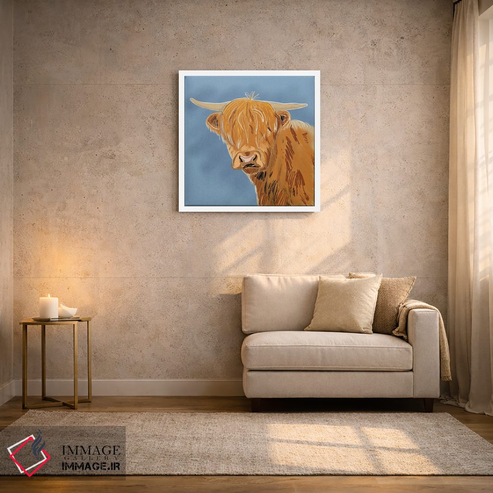 برای اتاقی که به یک عنصر دوستداشتنی نیاز دارد، «گاو کوهستانی» اثرِ «کالی ویلسون» به دیوار، انرژیِ نرم و زنده میدهد؛ برای دکورهای مدرن و مینیمال انتخابی خوشسلیقه است. به دیوار، قصه میدهد—اما قصهای آرام و شیک.