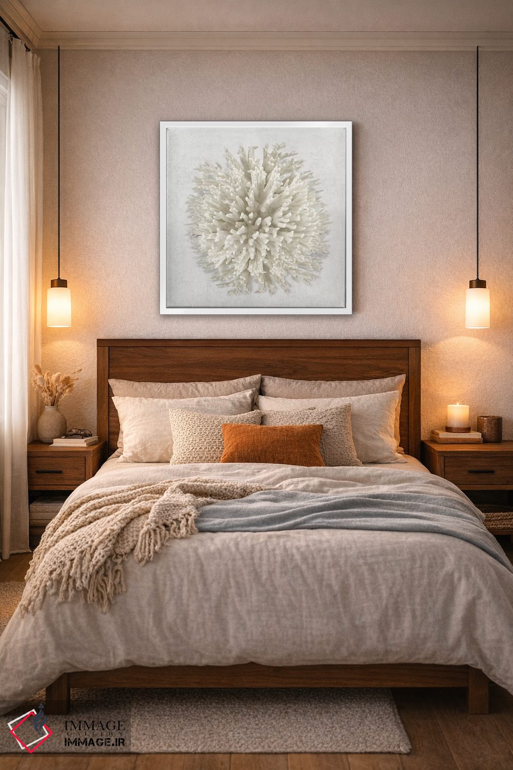 براساس پالت خنثی اثر، قاب بلوط روشن (چوبی) پیشنهاد اول است و استخوانی ملایم مکمل. برای سفارشهای پروژهای با ابعاد و قابهای اختصاصی با ایماژ در تماس باشید.