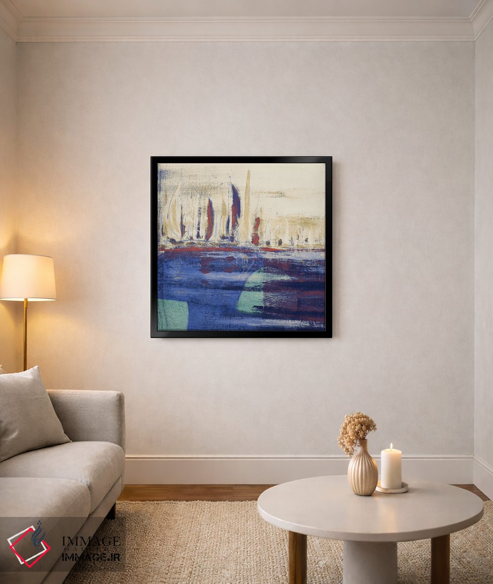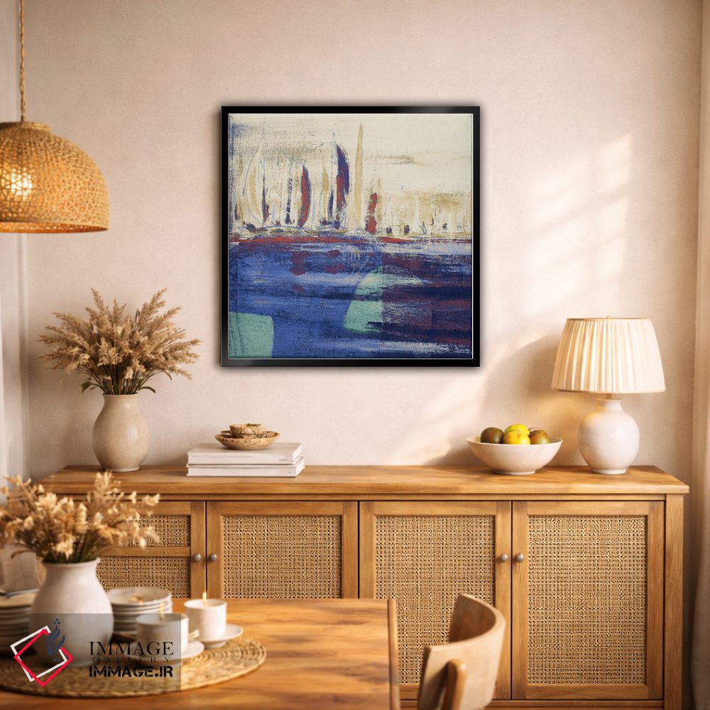 «آبهای آرام آبی مربع I» اثرِ «کینگزلی» یک انتخاب مدرن است؛ سبک هنری کمک میکند چیدمان مرتب بماند و دیوار حرفهای دیده شود.