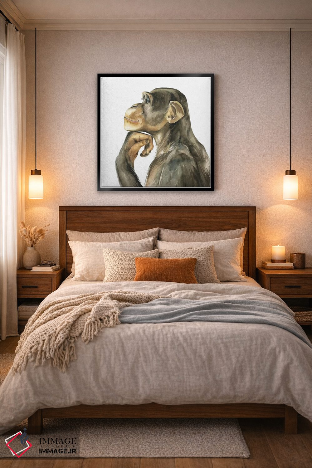 اگر میخواهید دیوار کمی سرزندگیِ محترمانه داشته باشد، «میمون» اثرِ «کایرا بالان» فضا را صمیمیتر و دعوتکنندهتر نشان میدهد، برای نشیمنهای خانوادگی گزینهٔ مناسبیست. حسش صمیمی است، اما کیفیتش جدی و خوشپرداخت.