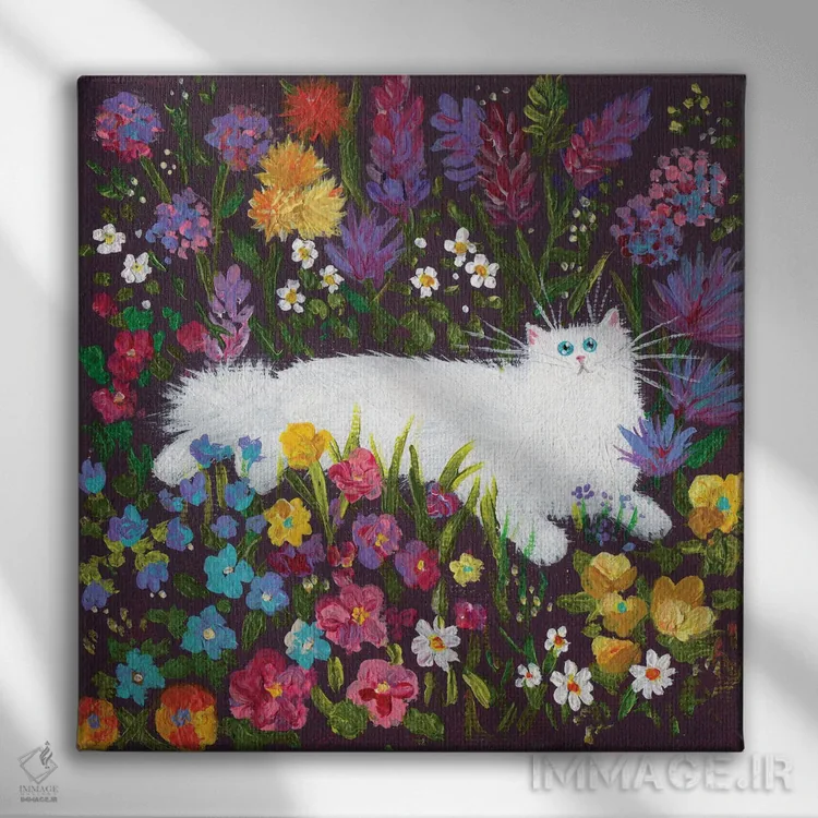تابلو دکوراتیو گربه سفید در میان گل ها اثر کیم هاسکینز