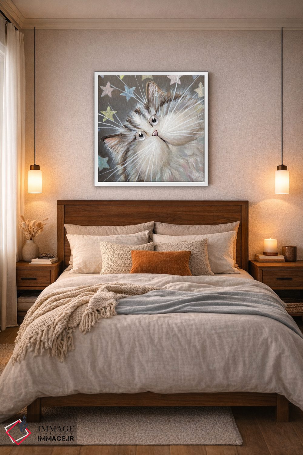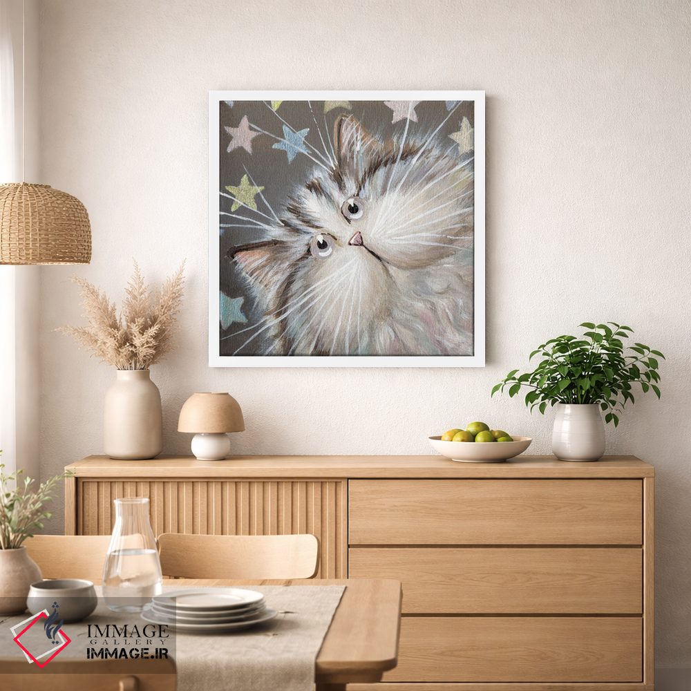 براساس پالت گرم اثر، قاب بلوط روشن (چوبی) پیشنهاد اول است و استخوانی ملایم مکمل. برای سفارشهای پروژهای با ابعاد و قابهای اختصاصی با ایماژ در تماس باشید.