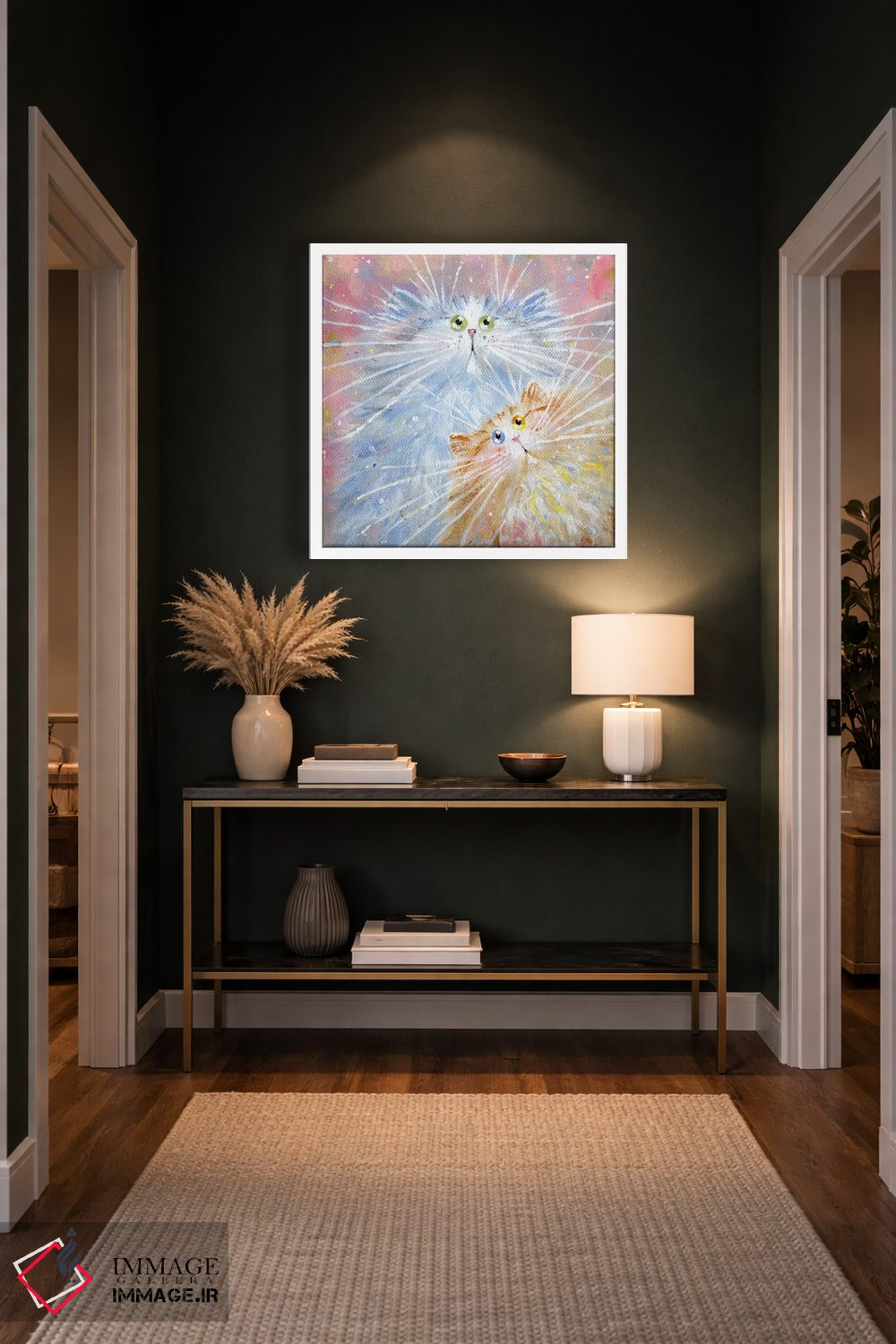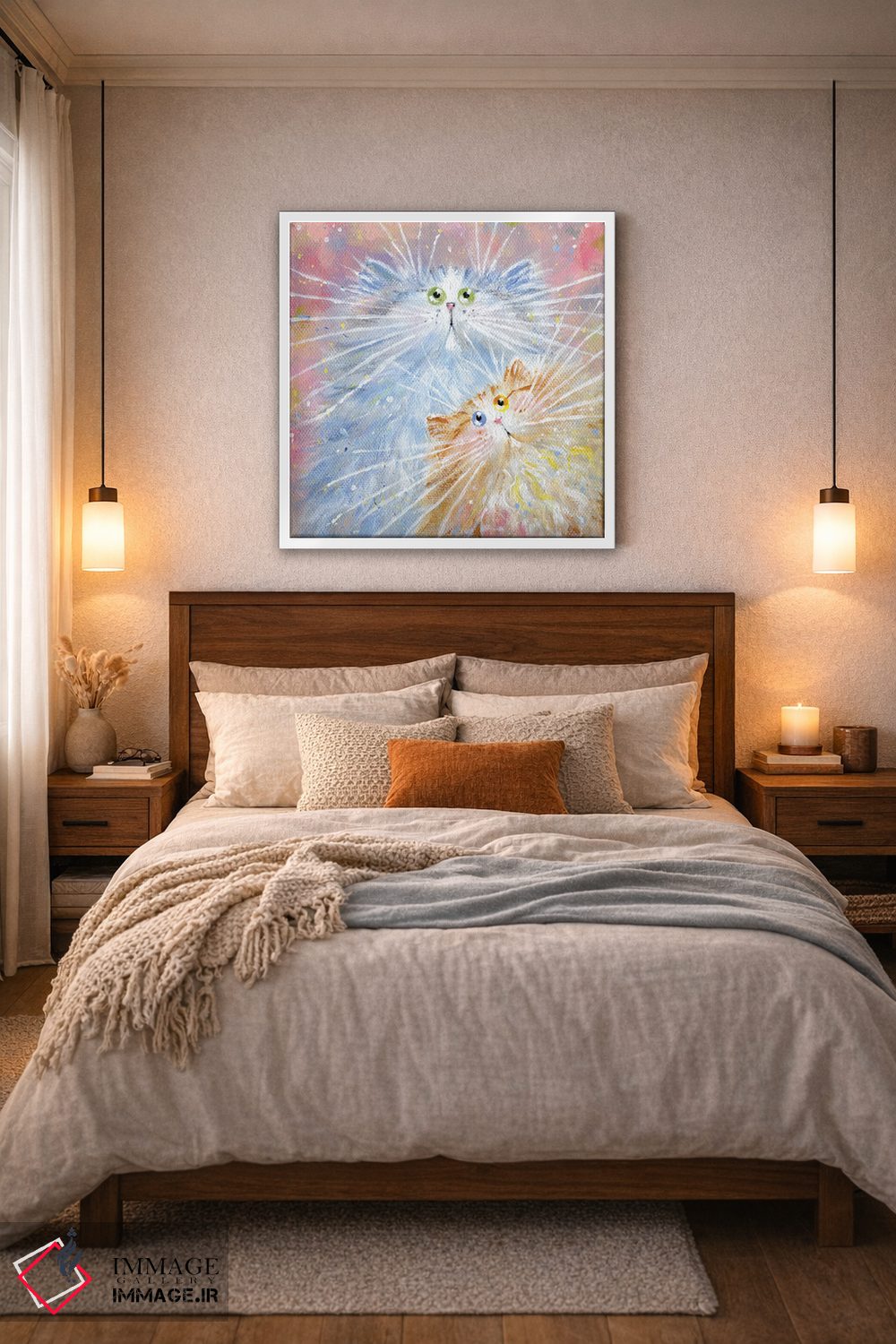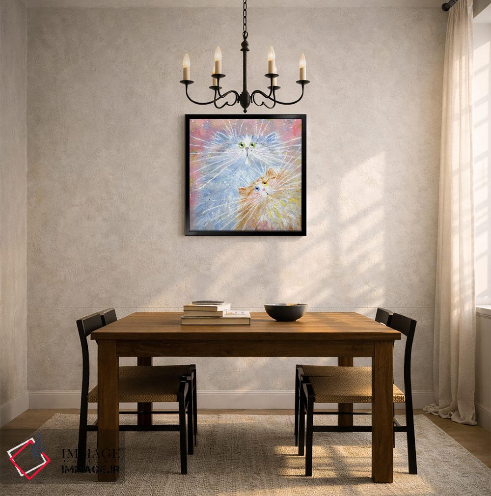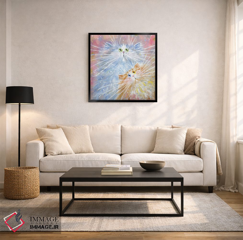 براساس پالت گرم اثر، قاب بلوط روشن (چوبی) پیشنهاد اول است و استخوانی ملایم مکمل. برای سفارشهای پروژهای با ابعاد و قابهای اختصاصی با ایماژ در تماس باشید.