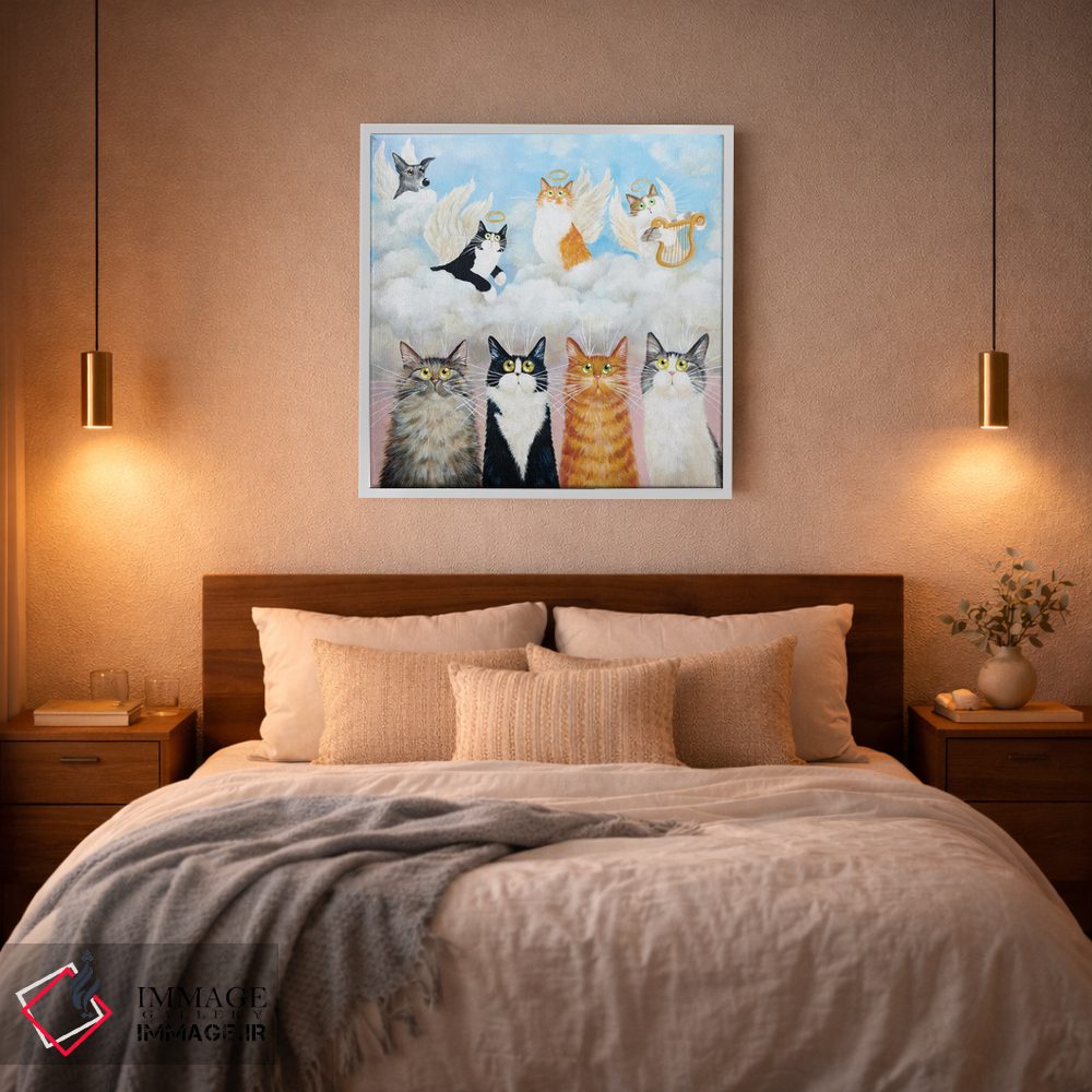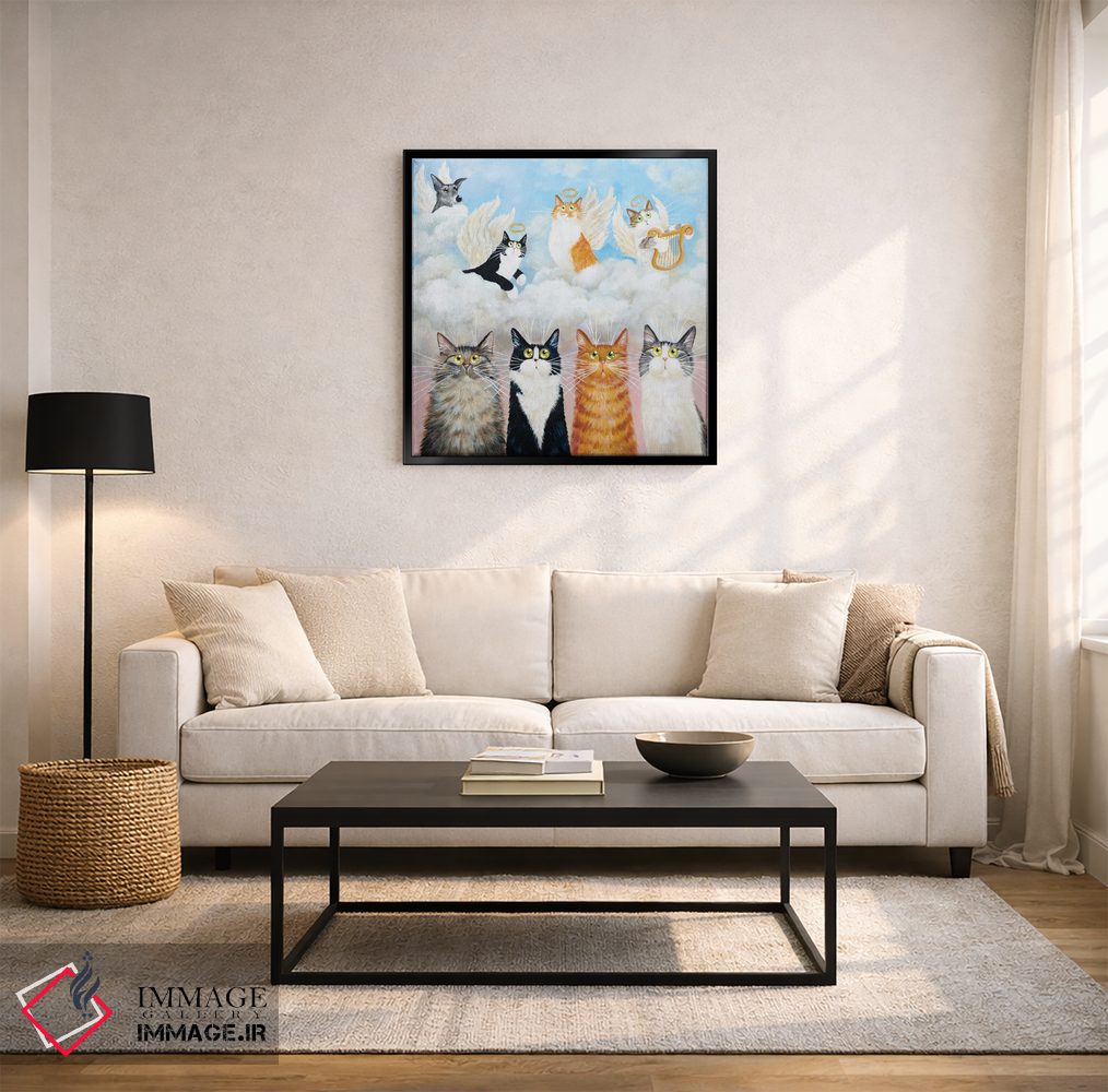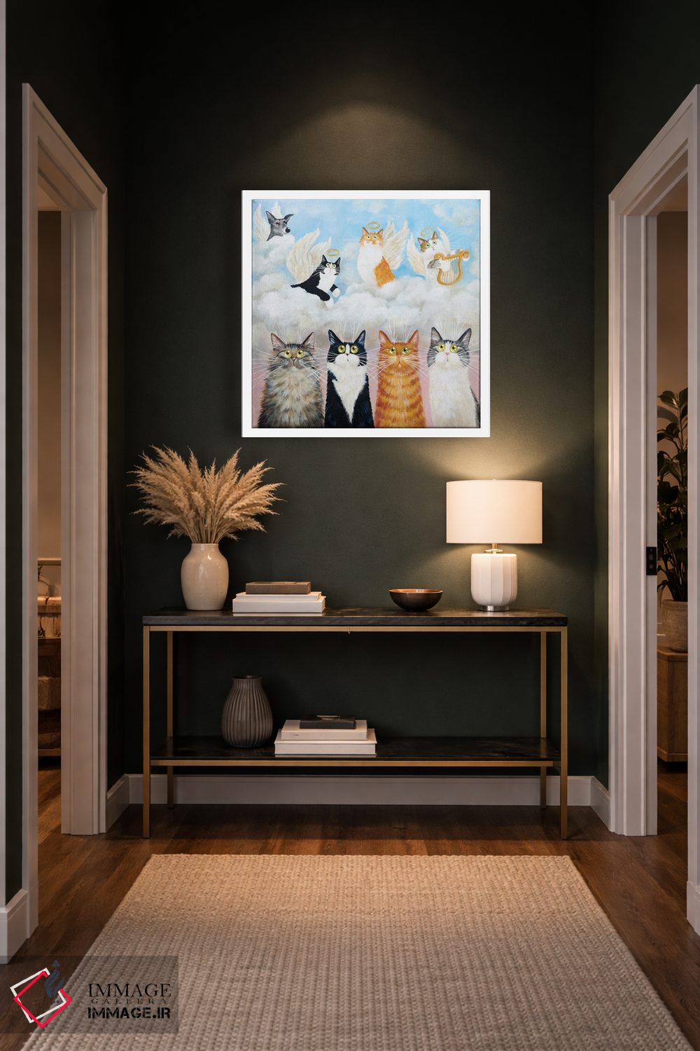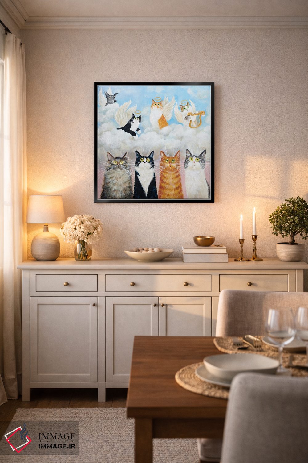 برای دکورهای صمیمی، «روی زمین و در بهشت» اثرِ «کیم هاسکینز» در کنار رنگهای خنثی، تضاد دلچسبی میسازد؛ برای اتاق کودک (بدون لحن کودکانه) انتخابی خوشسلیقه است. هر بار نگاهش میکنید، یک جزئیات تازه به چشم میآید.