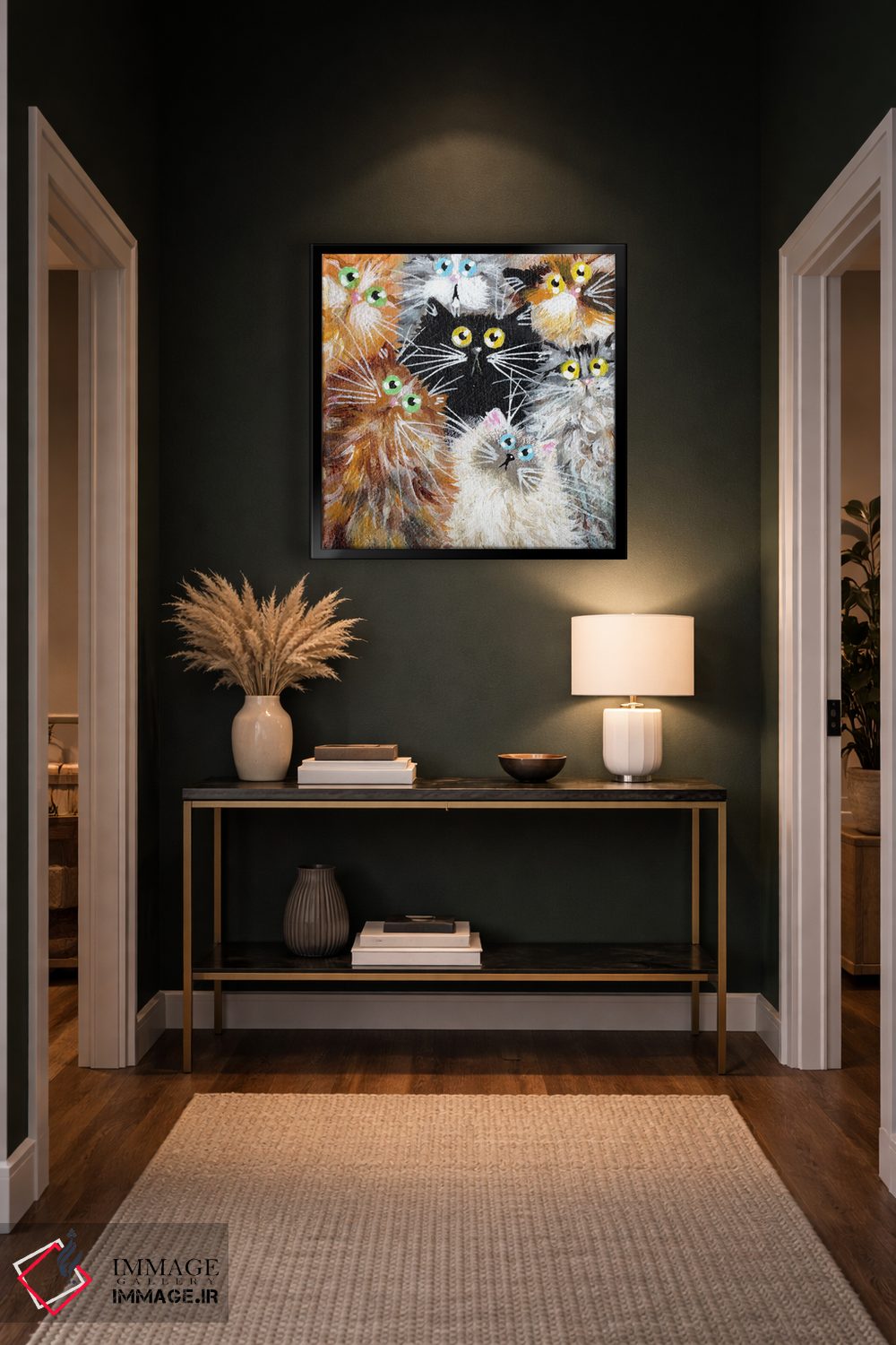 نارنجی میتواند یک اکسنتِ کوچک اما موثر باشد؛ یک تابلو کوچک مکمل را با نارنجی در نظر بگیرید تا ترکیببندی قویتر شود. انتخاب قاب هم میتواند این اکسنت را تقویت کند.