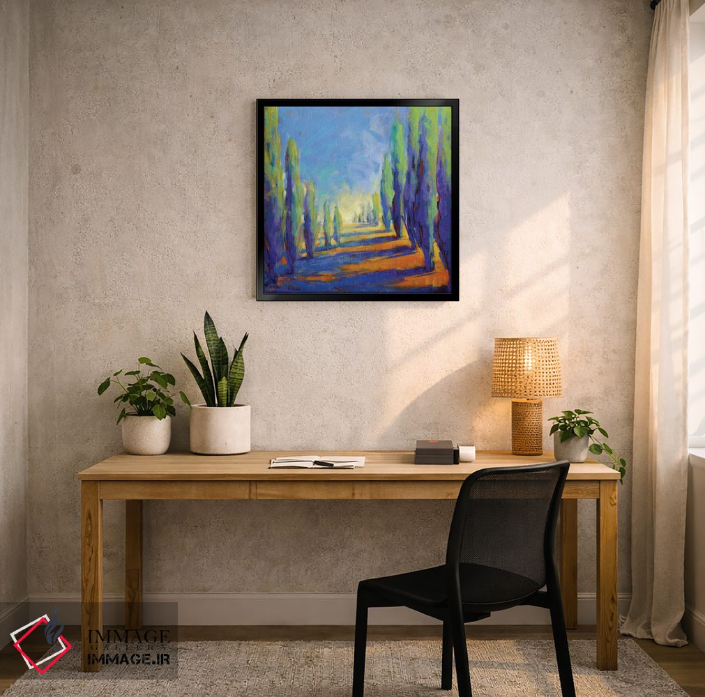 براساس پالت ترکیبی اثر، قاب تیک گرم (چوبی) پیشنهاد اول است و مشکی مات (فریم متوسط) مکمل. برای سفارشهای پروژهای با ابعاد و قابهای اختصاصی با ایماژ در تماس باشید.