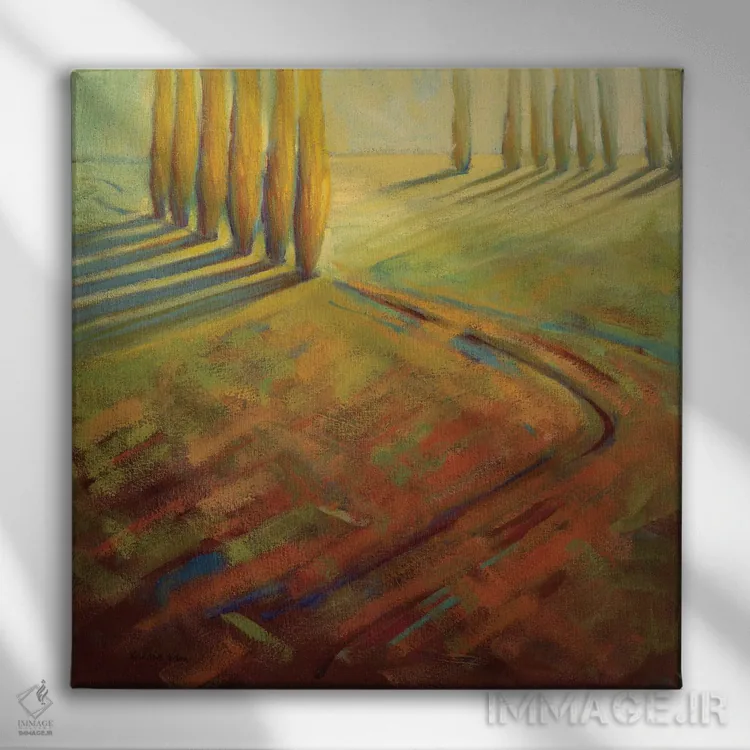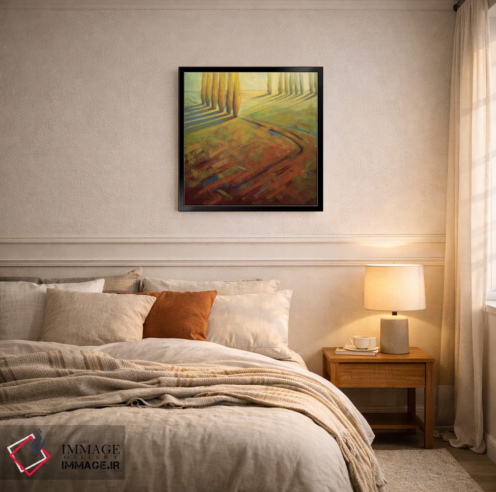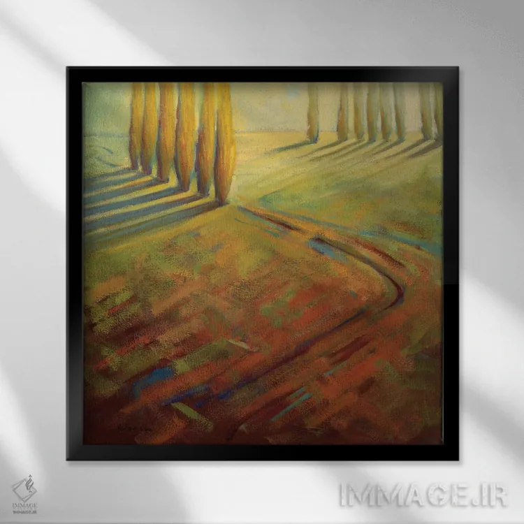 براساس پالت ترکیبی اثر، قاب تیک گرم (چوبی) پیشنهاد اول است و مشکی مات (فریم متوسط) مکمل. برای سفارشهای پروژهای با ابعاد و قابهای اختصاصی با ایماژ در تماس باشید.