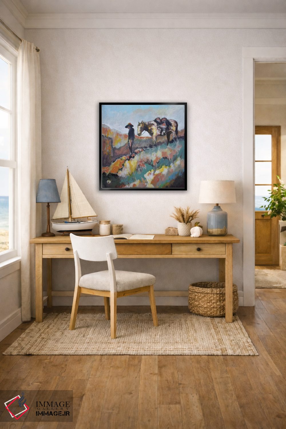 براساس پالت ترکیبی اثر، قاب بلوط روشن (چوبی) پیشنهاد اول است و استخوانی ملایم مکمل. برای سفارشهای پروژهای با ابعاد و قابهای اختصاصی با ایماژ در تماس باشید.