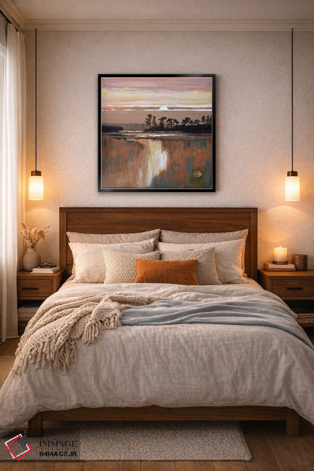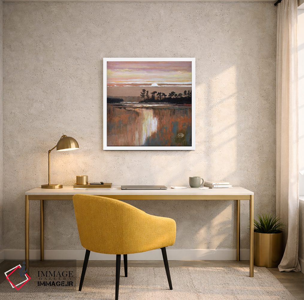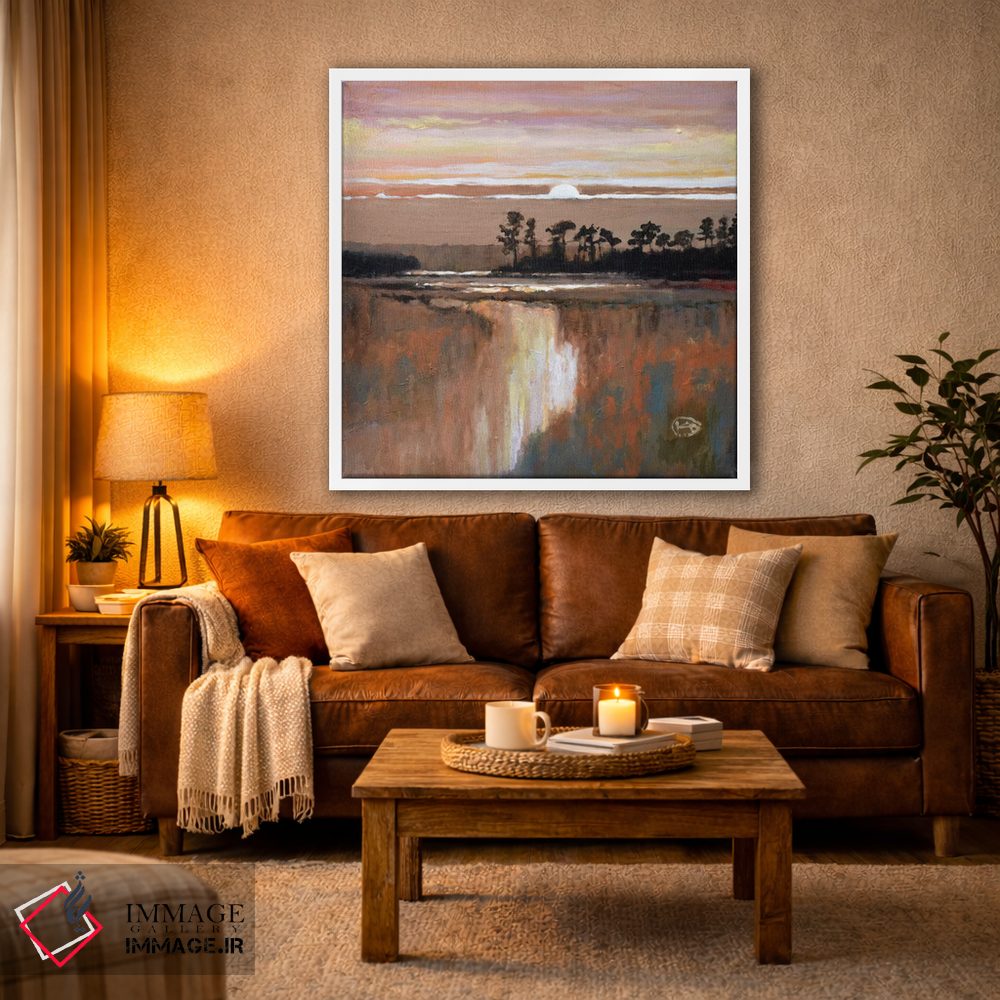 براساس پالت گرم اثر، قاب بلوط روشن (چوبی) پیشنهاد اول است و استخوانی ملایم مکمل. برای سفارشهای پروژهای با ابعاد و قابهای اختصاصی با ایماژ در تماس باشید.
