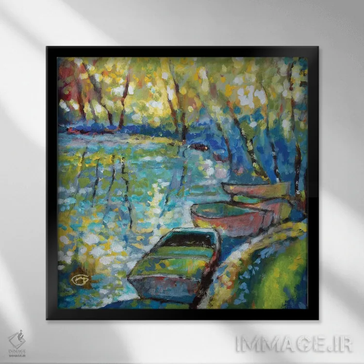 براساس پالت ترکیبی اثر، قاب تیک گرم (چوبی) پیشنهاد اول است و مشکی مات (فریم متوسط) مکمل. برای سفارشهای پروژهای با ابعاد و قابهای اختصاصی با ایماژ در تماس باشید.