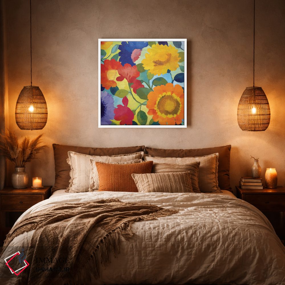 براساس پالت ترکیبی اثر، قاب تیک گرم (چوبی) پیشنهاد اول است و مشکی مات (فریم متوسط) مکمل. برای سفارشهای پروژهای با ابعاد و قابهای اختصاصی با ایماژ در تماس باشید.