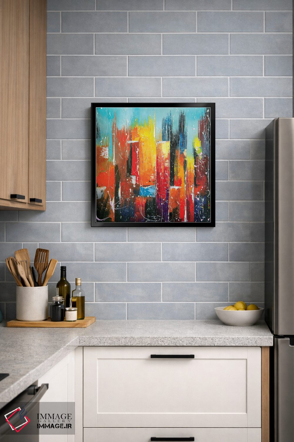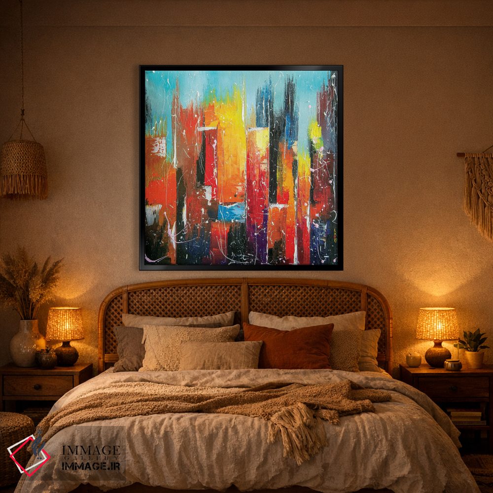 براساس پالت ترکیبی اثر، قاب تیک گرم (چوبی) پیشنهاد اول است و مشکی مات (فریم متوسط) مکمل. برای سفارشهای پروژهای با ابعاد و قابهای اختصاصی با ایماژ در تماس باشید.