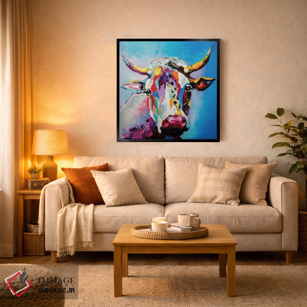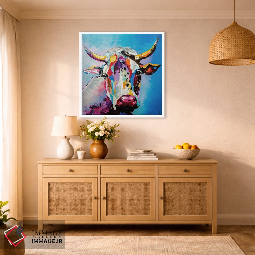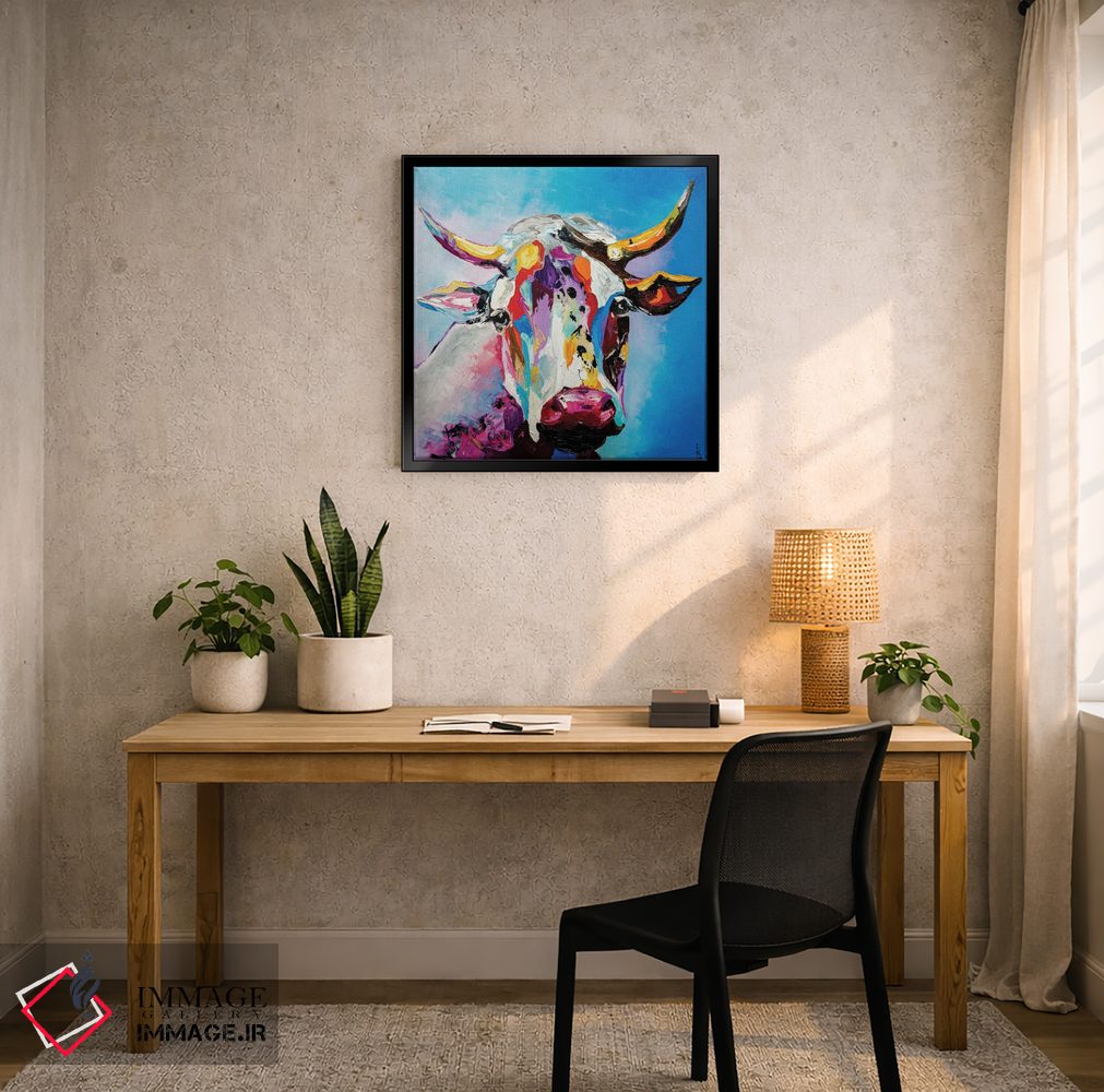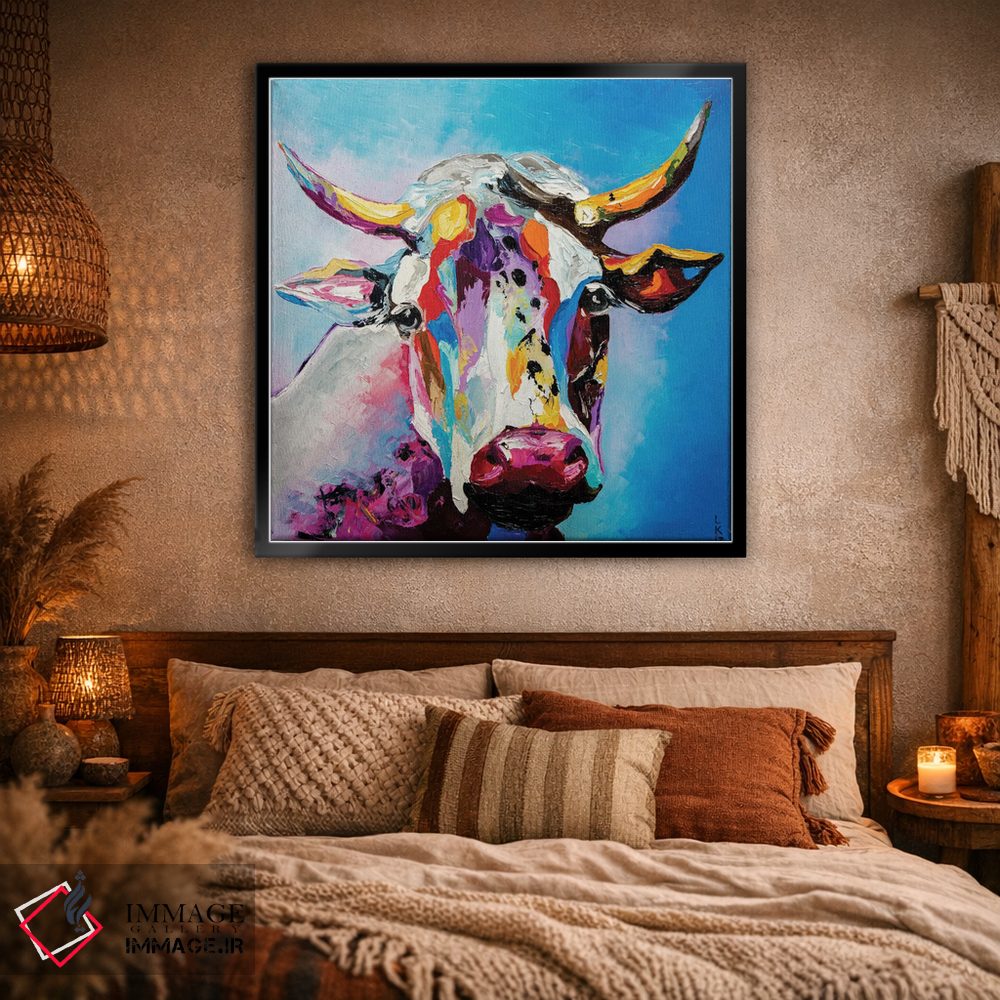 برای دیوارهای ساده، «گاو» اثرِ «کوپتسووا آرت (استودیو یا برند هنری)» فضا را صمیمیتر و دعوتکنندهتر نشان میدهد؛ برای راهروها و ورودیهای گرم انتخابی خوشسلیقه است. با نورپردازی نقطهای، جذابتر هم میشود.