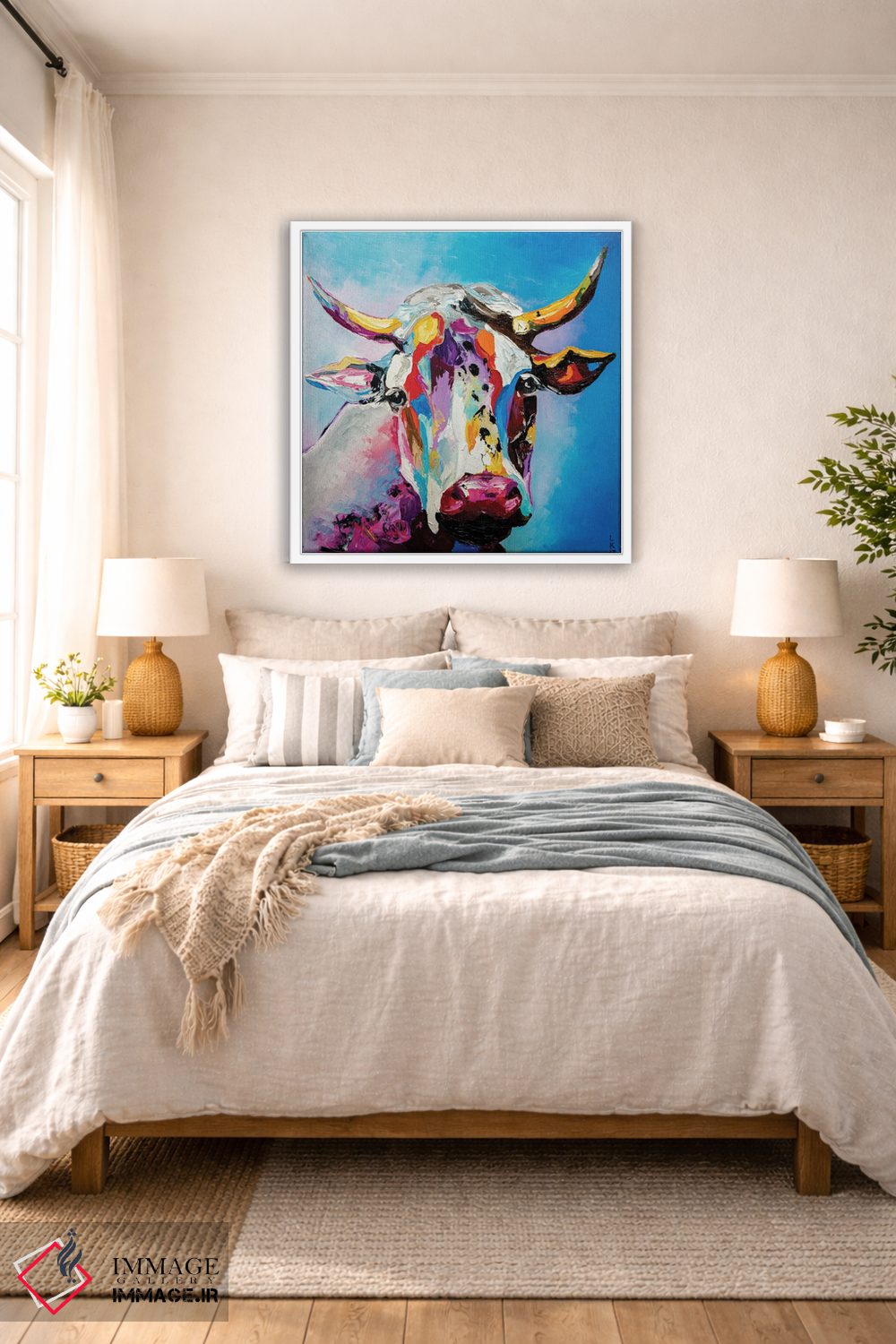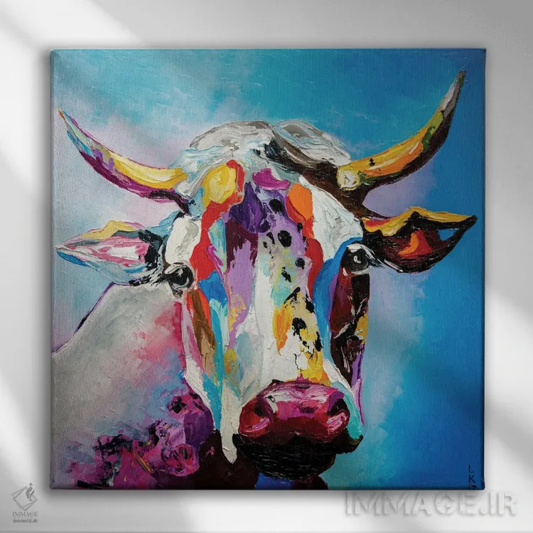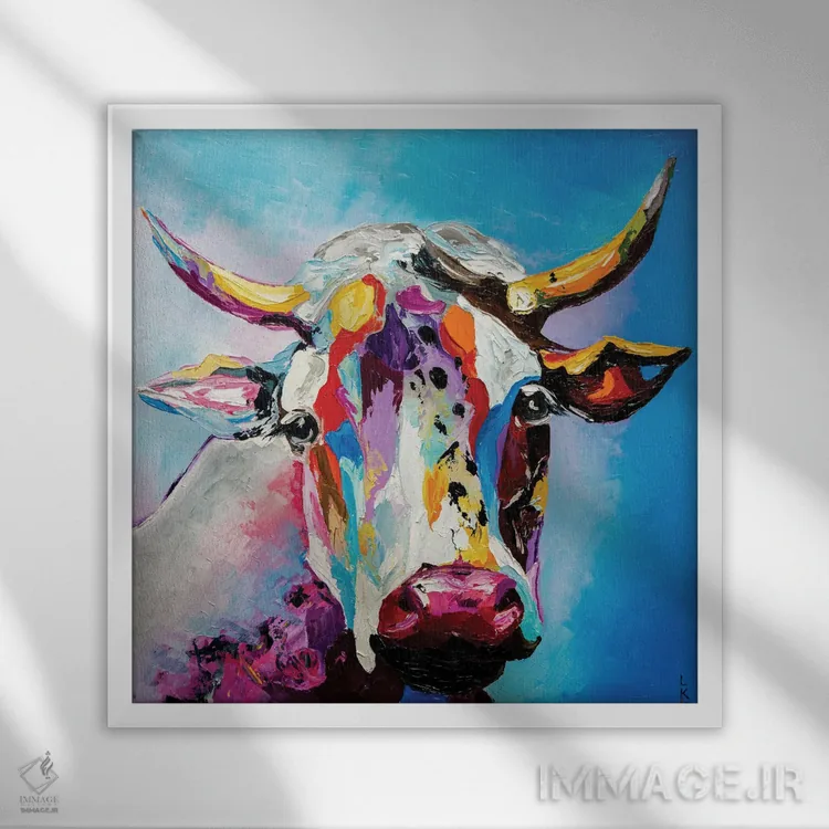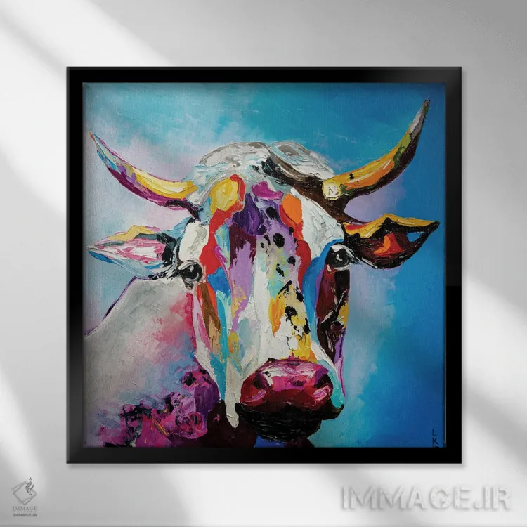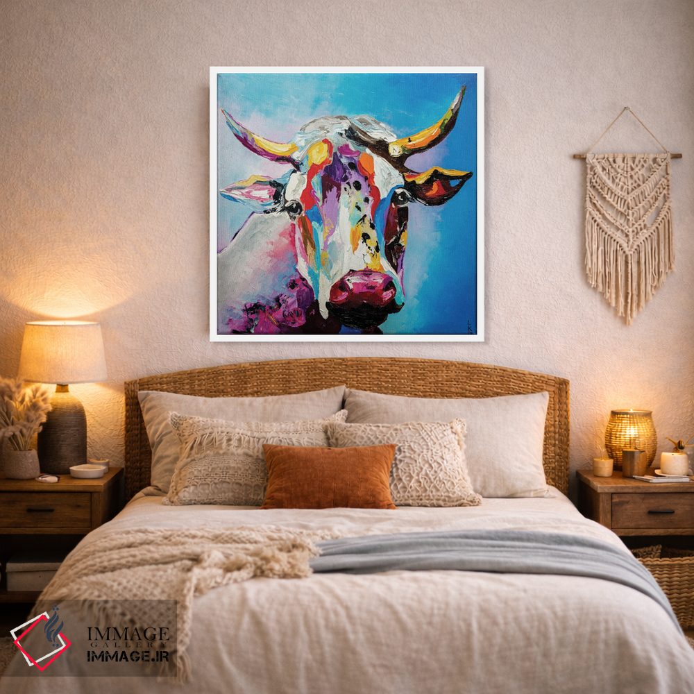 برای دیوارهای ساده، «گاو» اثرِ «کوپتسووا آرت (استودیو یا برند هنری)» فضا را صمیمیتر و دعوتکنندهتر نشان میدهد؛ برای راهروها و ورودیهای گرم انتخابی خوشسلیقه است. با نورپردازی نقطهای، جذابتر هم میشود.