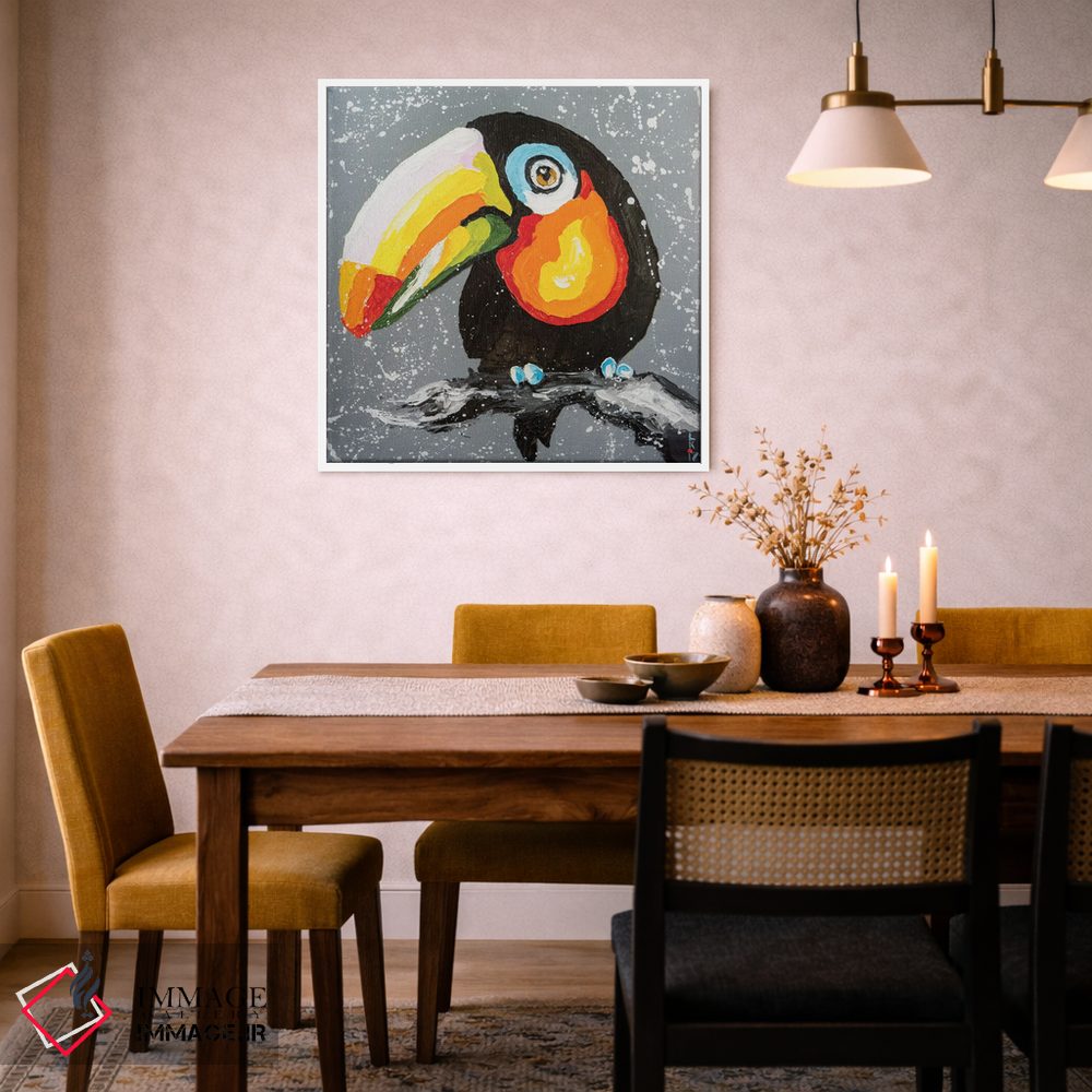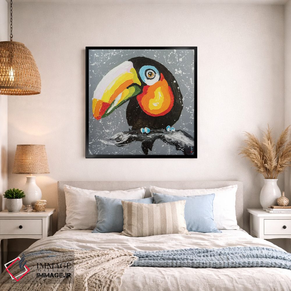 برای دکورهای صمیمی، «توکانی خندهدار» اثرِ «کوپتسووا آرت (استودیو یا برند هنری)» به دیوار، انرژیِ نرم و زنده میدهد؛ برای راهروها و ورودیهای گرم انتخابی خوشسلیقه است. با قاب چوبی یا مشکی، حس مرتبتری پیدا میکند.