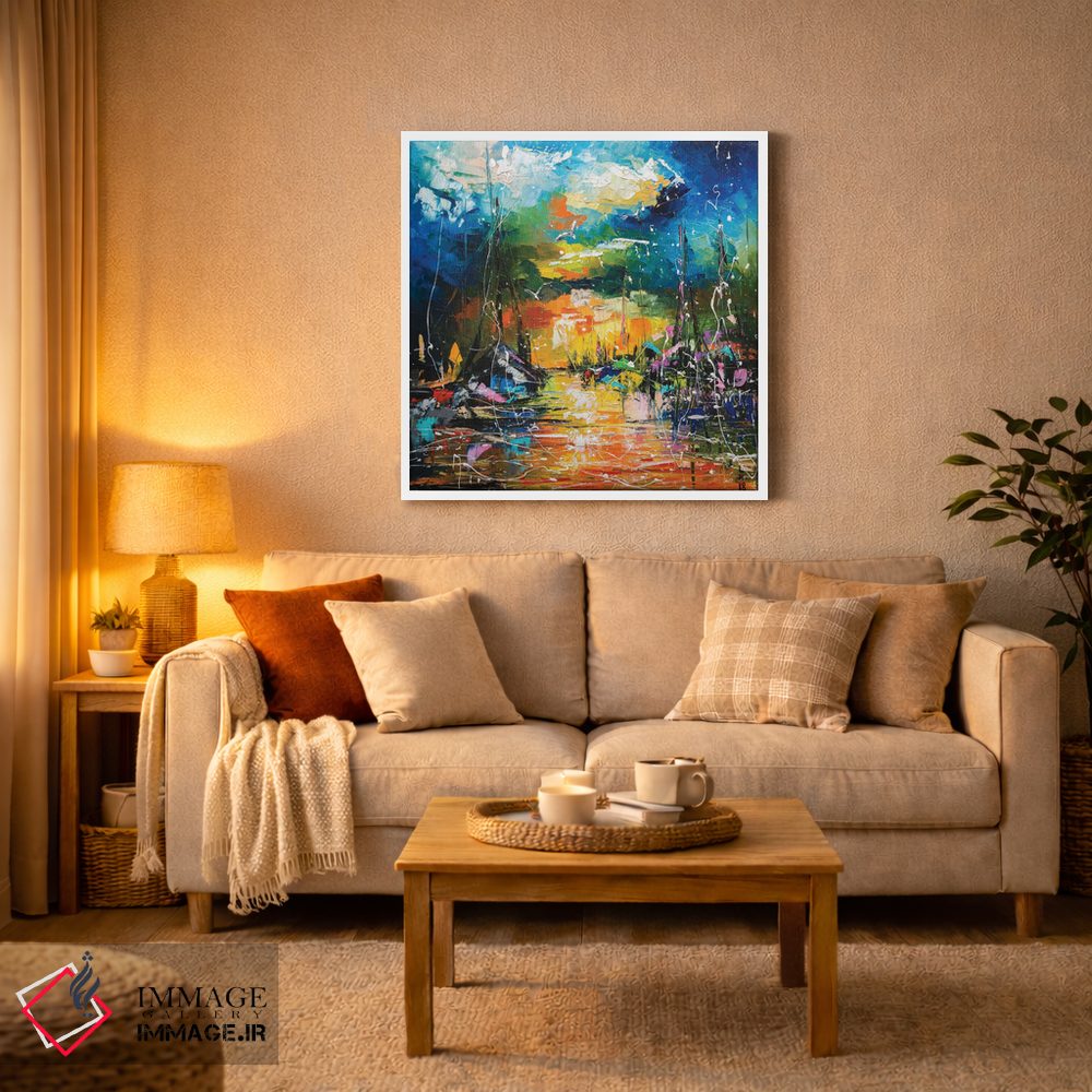 براساس پالت ترکیبی اثر، قاب تیک گرم (چوبی) پیشنهاد اول است و مشکی مات (فریم متوسط) مکمل. برای سفارشهای پروژهای با ابعاد و قابهای اختصاصی با ایماژ در تماس باشید.