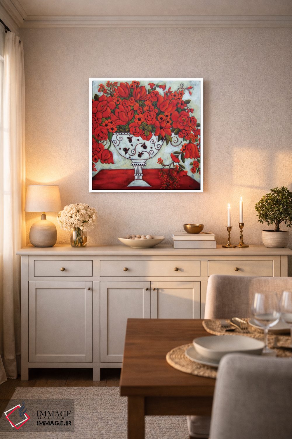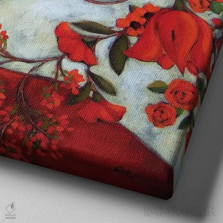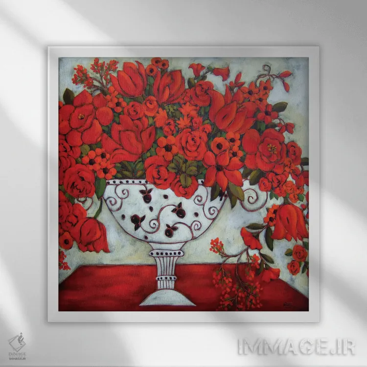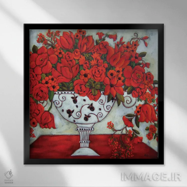 تابلو دکوراتیو گلدان عاجی با لاله های قرمز اثر کارن ریگر